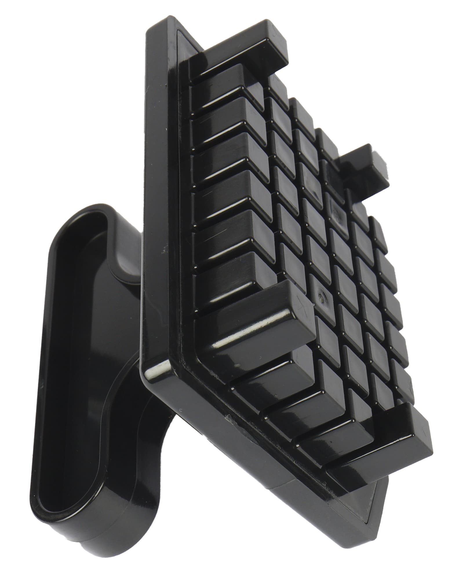 Следующий предмет — насадка для нарезки кубиками. Это массивный пластиковый диск с прямоугольным решетчатым ножом с краю и шпеньком в центре.