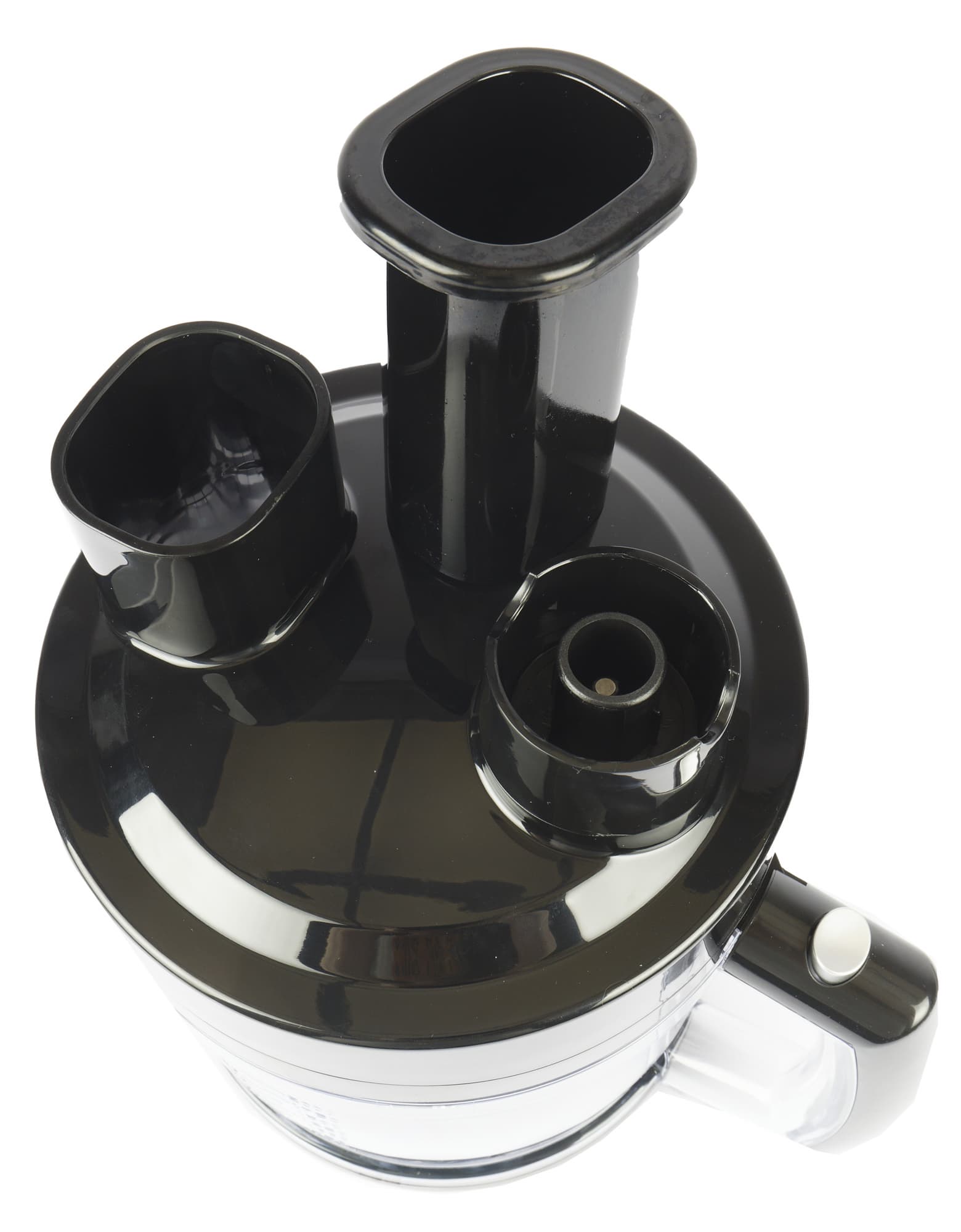 На крышке из черного пластика два выступа: один, как труба прямоугольной формы со скругленным углами (для подачи продуктов), второй — гнездо для подключения моторного блока. В трубу для продуктов вставляется толкатель точно повторяющий форму отверстия. Внутренний размер загрузочного отверстия приблизительно 4,7×5,5 см.