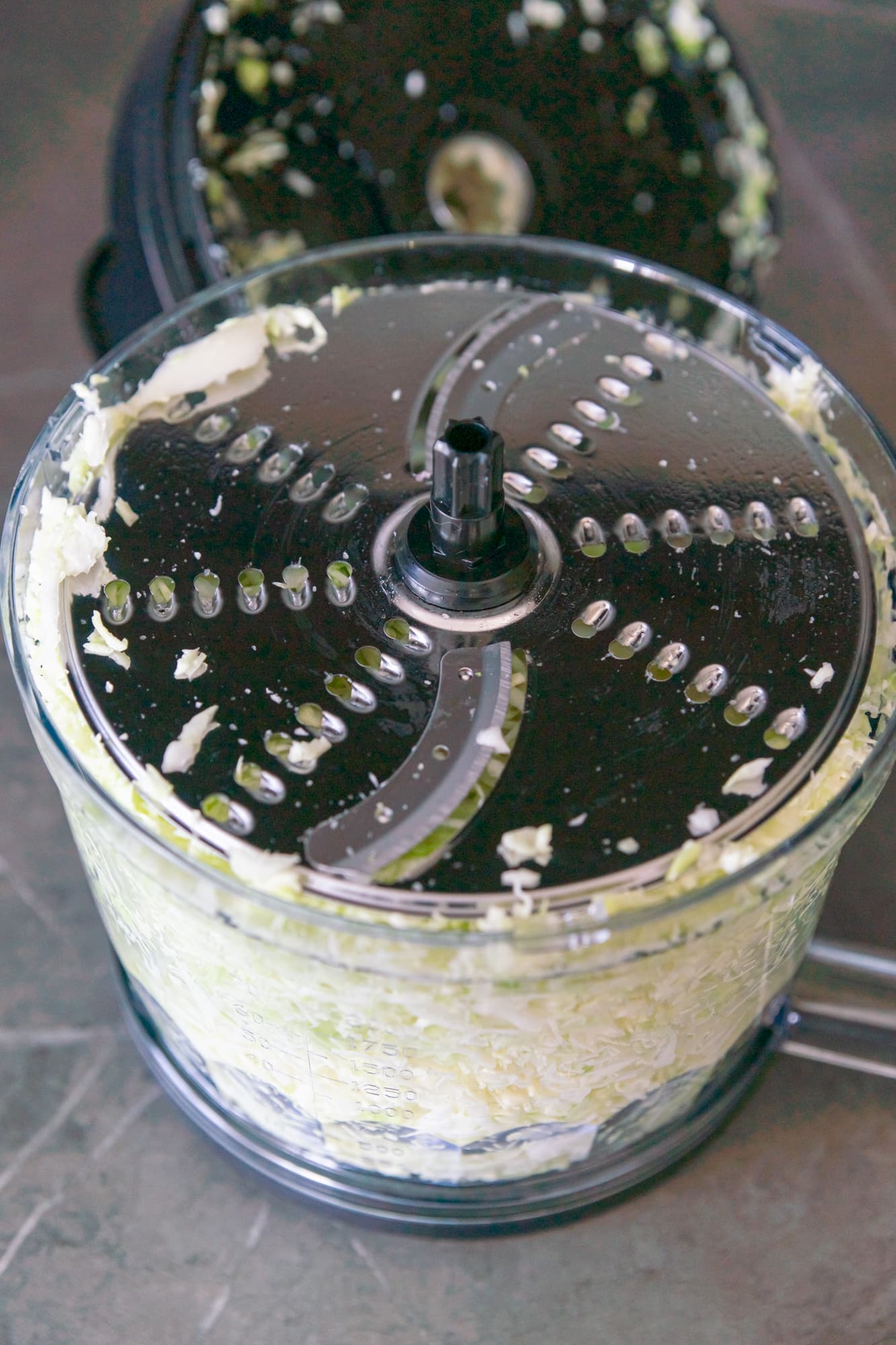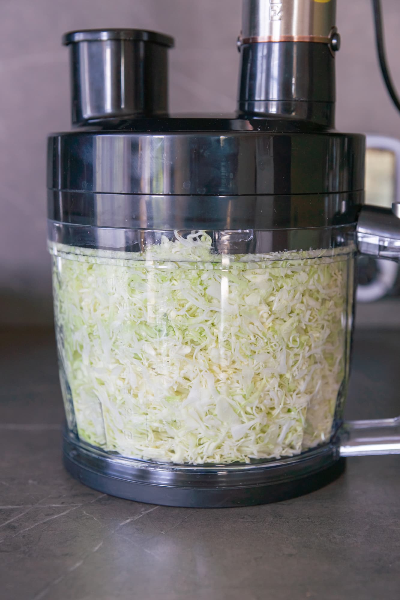 650 г капусты заняли всю чашу доверху. Блендер работал на 3-й скорости в основном режиме ровно 1 минуту.