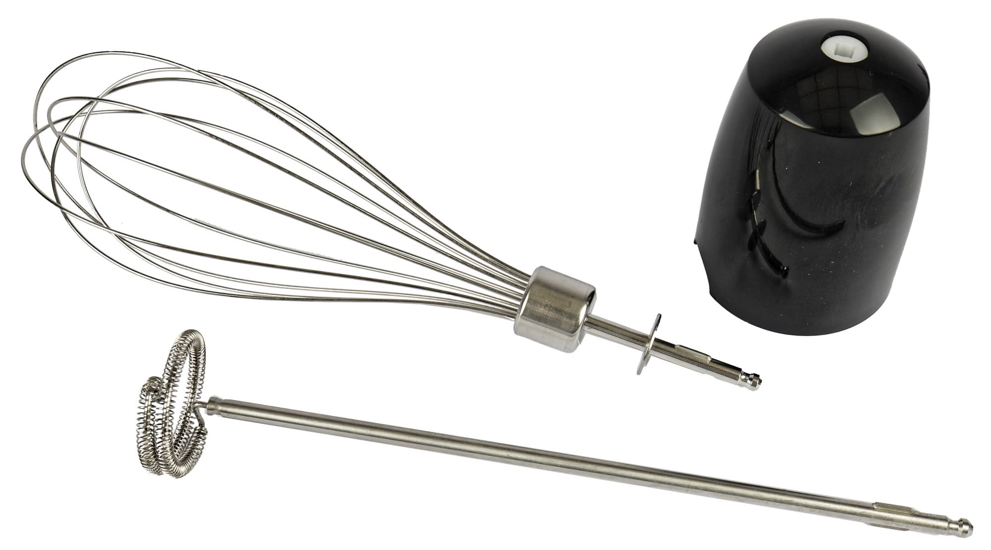 Венчик для взбивания стандартной формы также цельнометаллический. Единственное отличие от насадки-блендера — на моторный блок он крепится с помощью пластикового переходника. Этот же переходник используется и для насадки-вспенивателя молока (капучинатора).