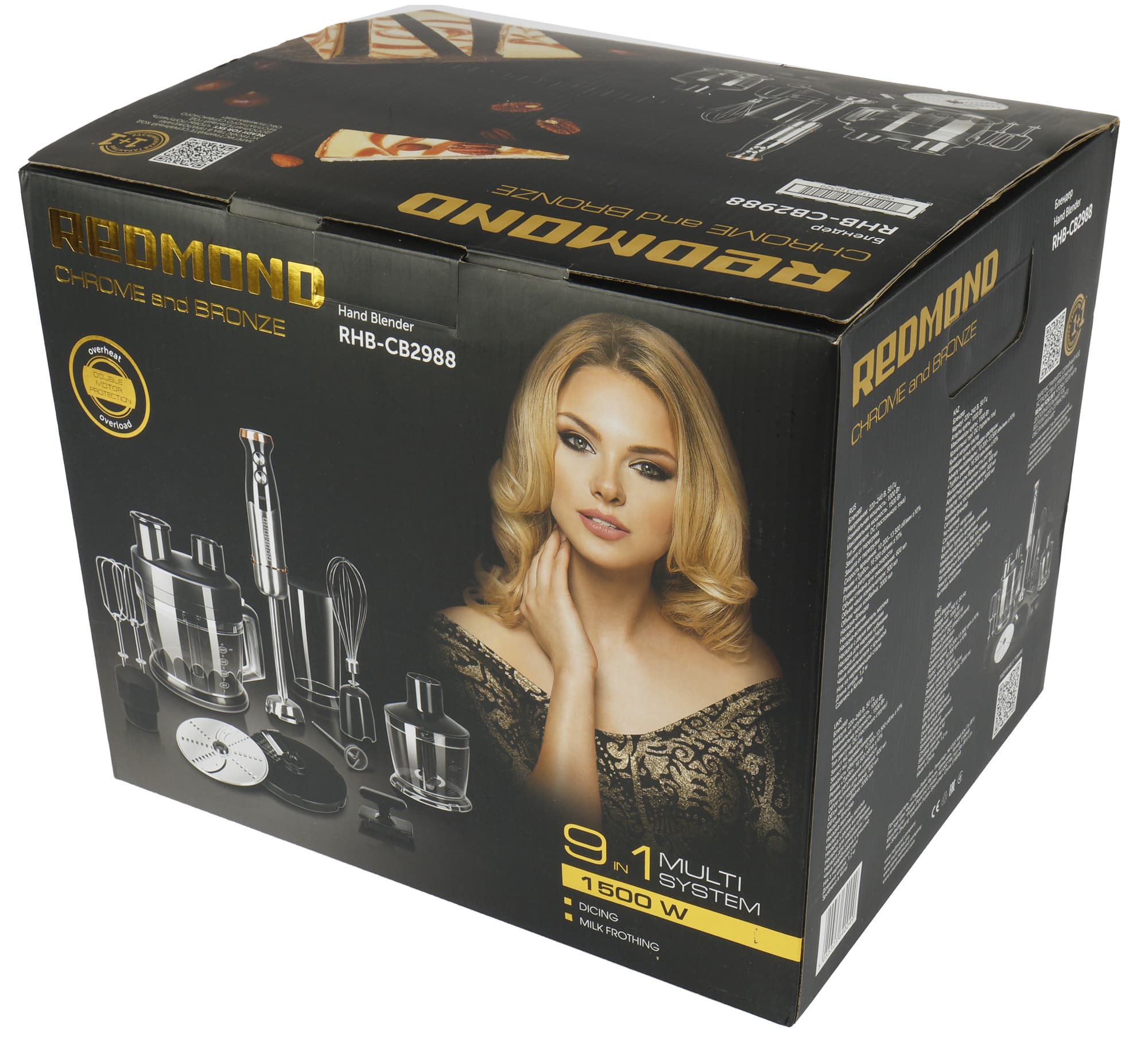Компактная картонная коробка с качественной полиграфией оформлена в лучших традициях Redmond — на черном фоне размещены яркие фотографии устройства со всеми насадками, красотки, привлекающей дополнительное внимание к упаковке и упоминание о том, что внутри не просто блендер, а мультисистема «9 в 1». Боковые грани коробки содержат подробное описание возможностей прибора и изображения аппетитных блюд, приготовленных с его помощью.