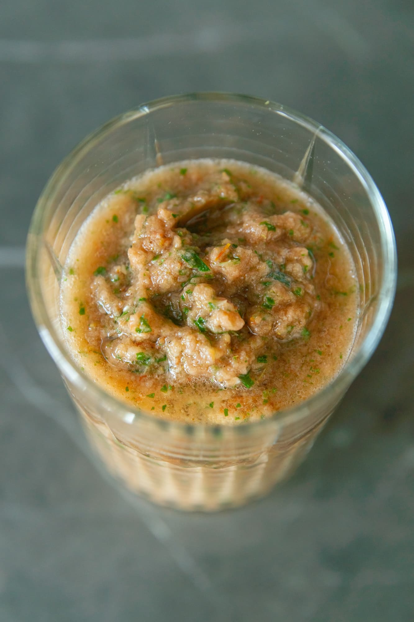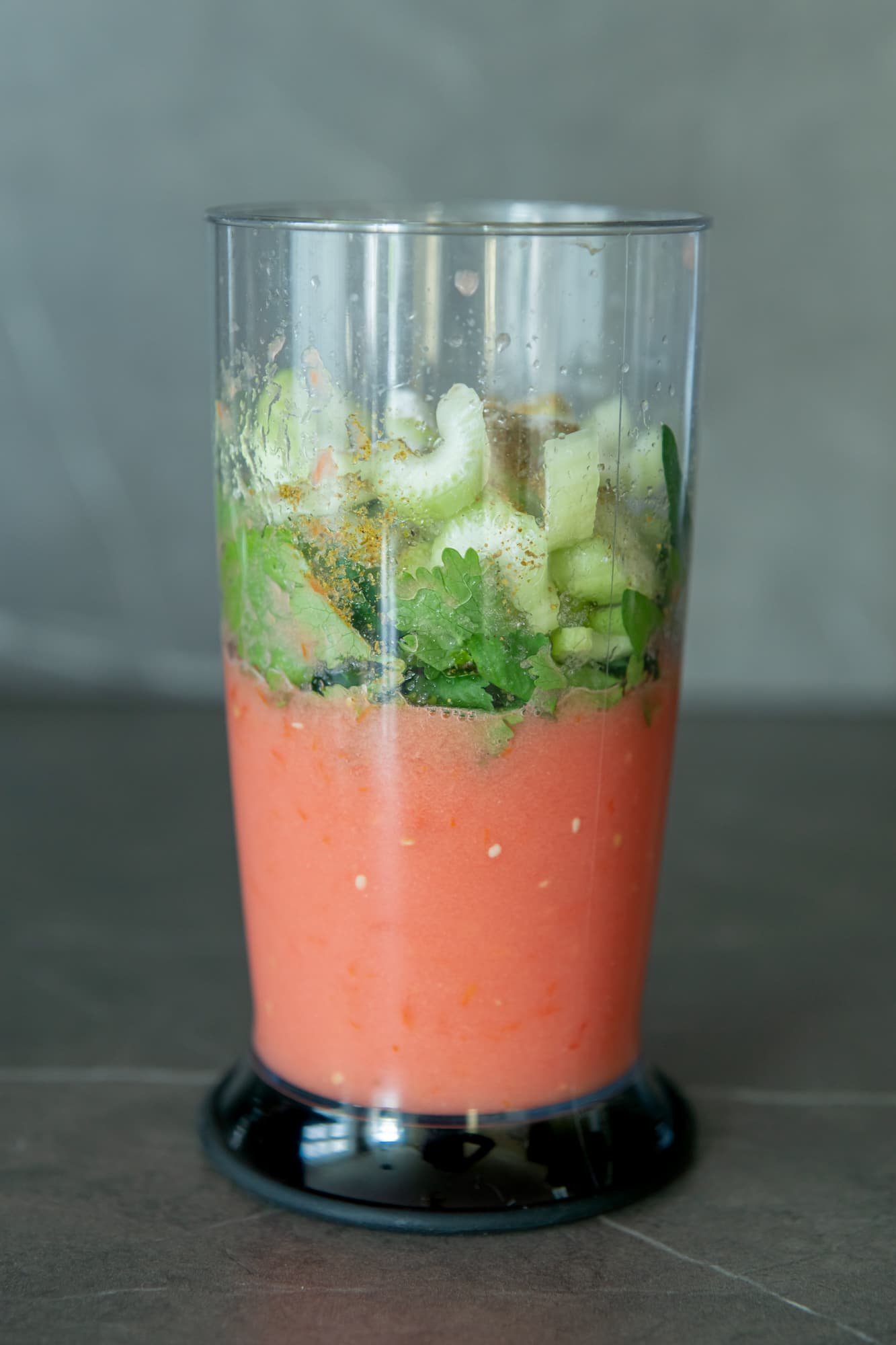 В виде факультатива добавили в измельченные томаты сельдерей, зелень, соль с перцем и запустили блендер на 3-й скорости. На обработку новых ингредиентов у прибора ушло 20 секунд. Полного измельчения зелени мы не добивались, нас больше интересовал волокнистый сельдерей. Целых кусочков от него не осталось, только плотная взбитая масса, смешанная с томатами, и насыщенный вкус.