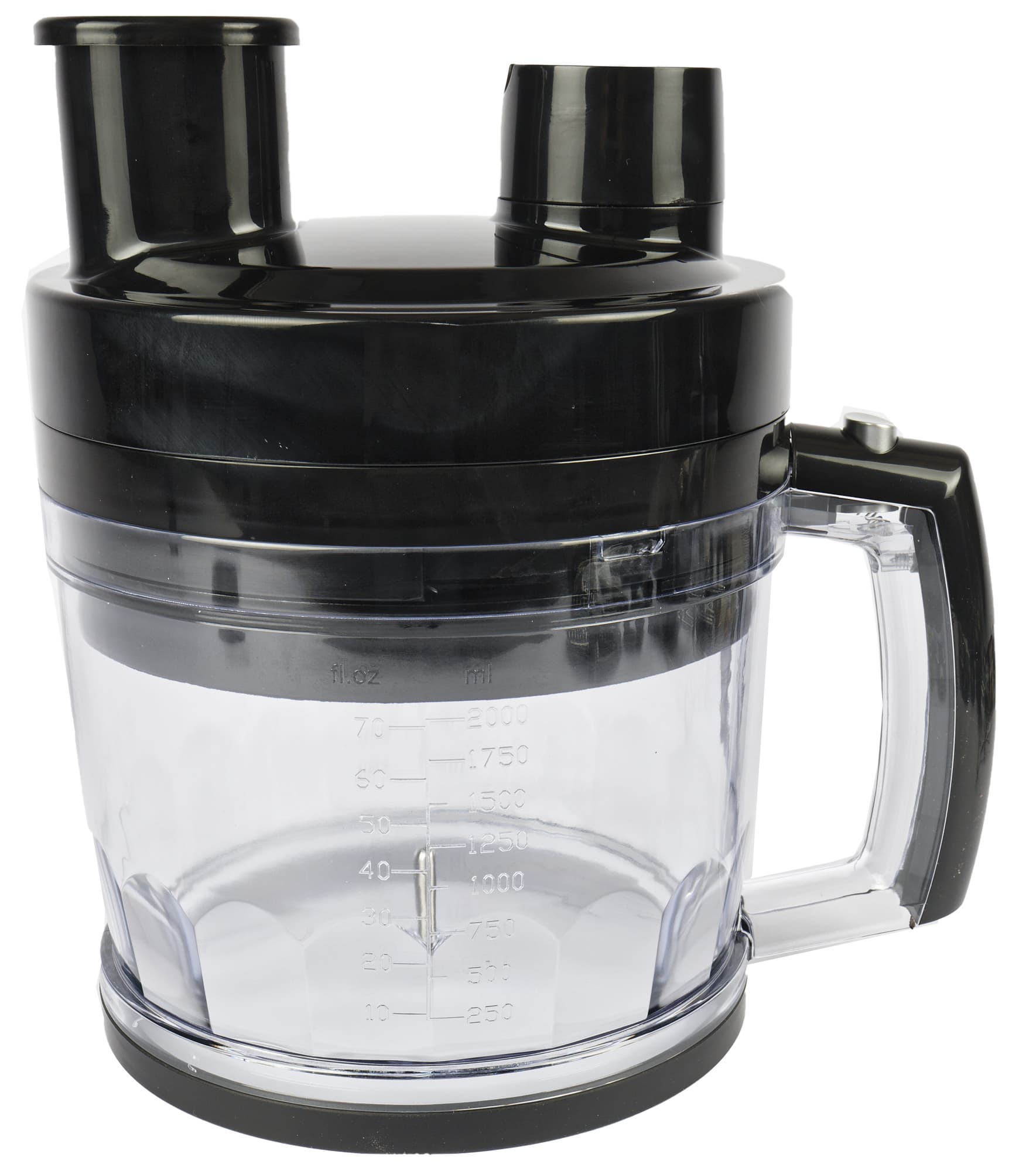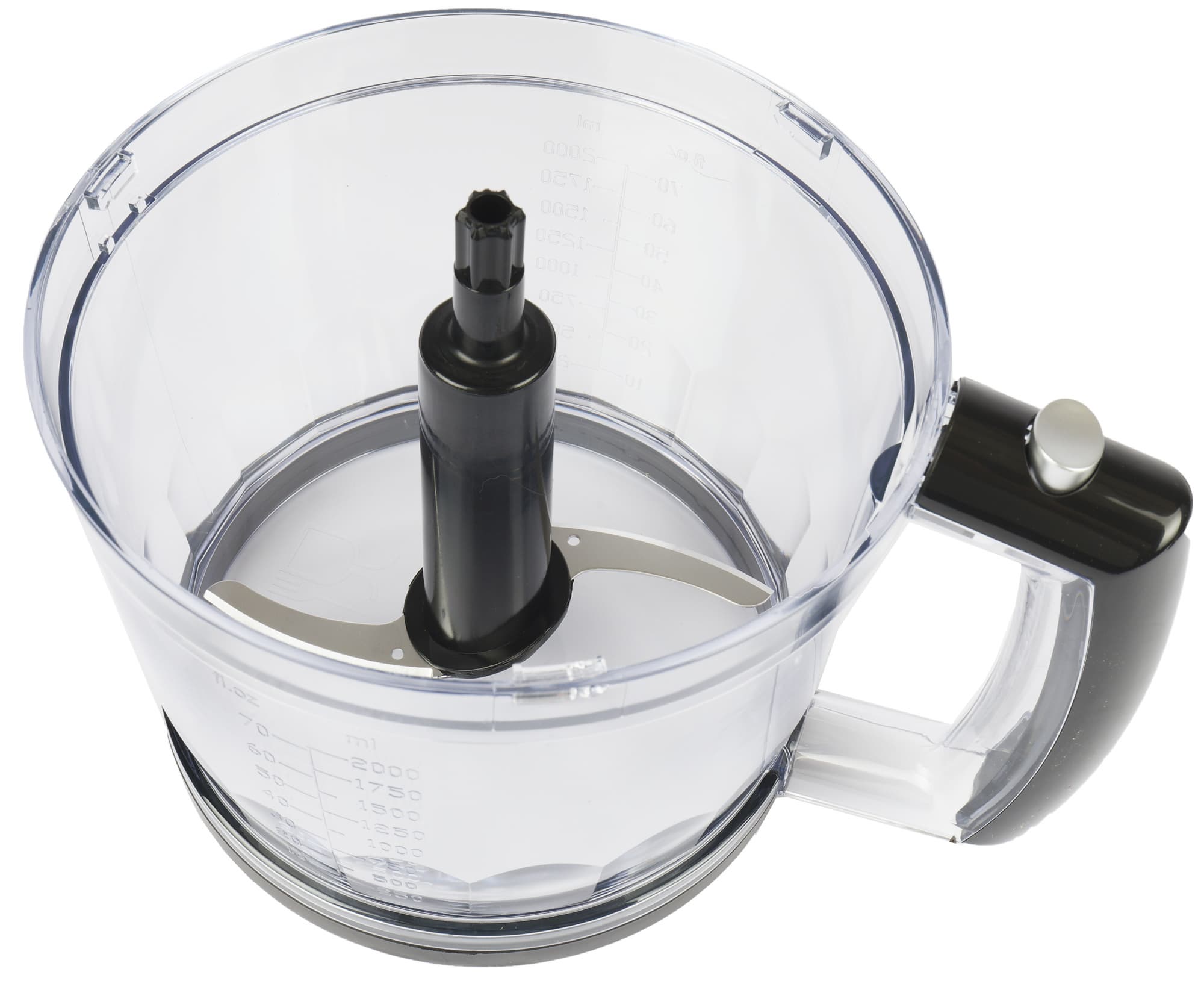 Большая чаша тоже изготовлена из прозрачного пластика. Основание емкости оснащено резиновым кольцом, улучшающим сцепление с поверхностью стола. На стенках чаши две шкалы: в унциях и миллилитрах (от 250 до 2000 мл).