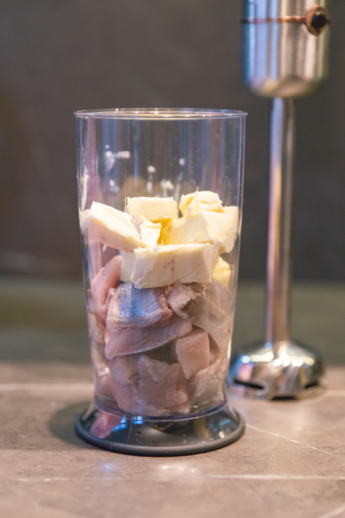 В стакан поместили нарезанную небольшими кусочками селедку и размягченное сливочное масло. Опустили в емкость погружной блендер и, повернув кольцо регулятора на 3-ю скорость, включили обычный режим. Блендер зажужжал, а продукты под ним постепенно стали превращаться в единую массу. Судя по звуку, никаких сложностей блендер не испытывал. Левой рукой мы придерживали стакан, а правой перемещали насадку вверх-вниз, и таким образом в общей сложности за 1,5 минуты мы полностью измельчили и хорошо взбили массу. Стакан, конечно, узковат, в процессе мы дважды останавливались и вытаскивали насадку, чтобы снять с нее шапку выдавленной наверх массы и скинуть ее вниз. В принципе, ничего сложного, но посуду для этих целей стоит выбирать пошире.