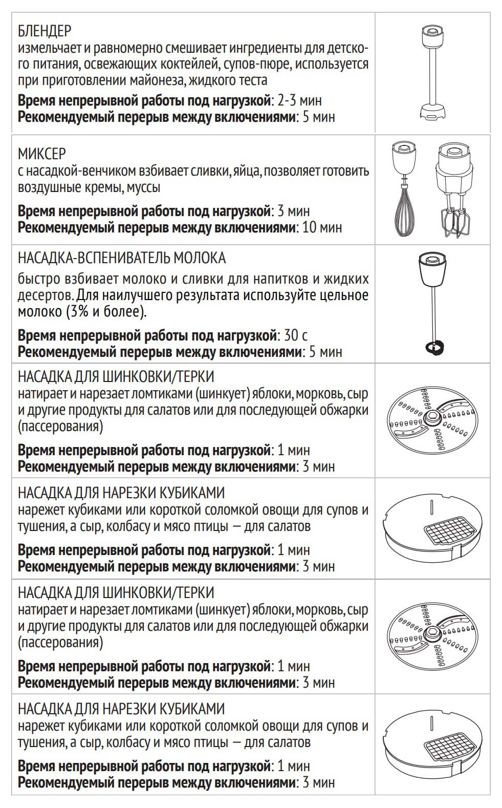 Дальше руководство содержит описание предназначения каждой насадки с указанием максимального времени непрерывной работы и рекомендуемого перерыва между включениями, а также правила ухода за прибором и его хранения.