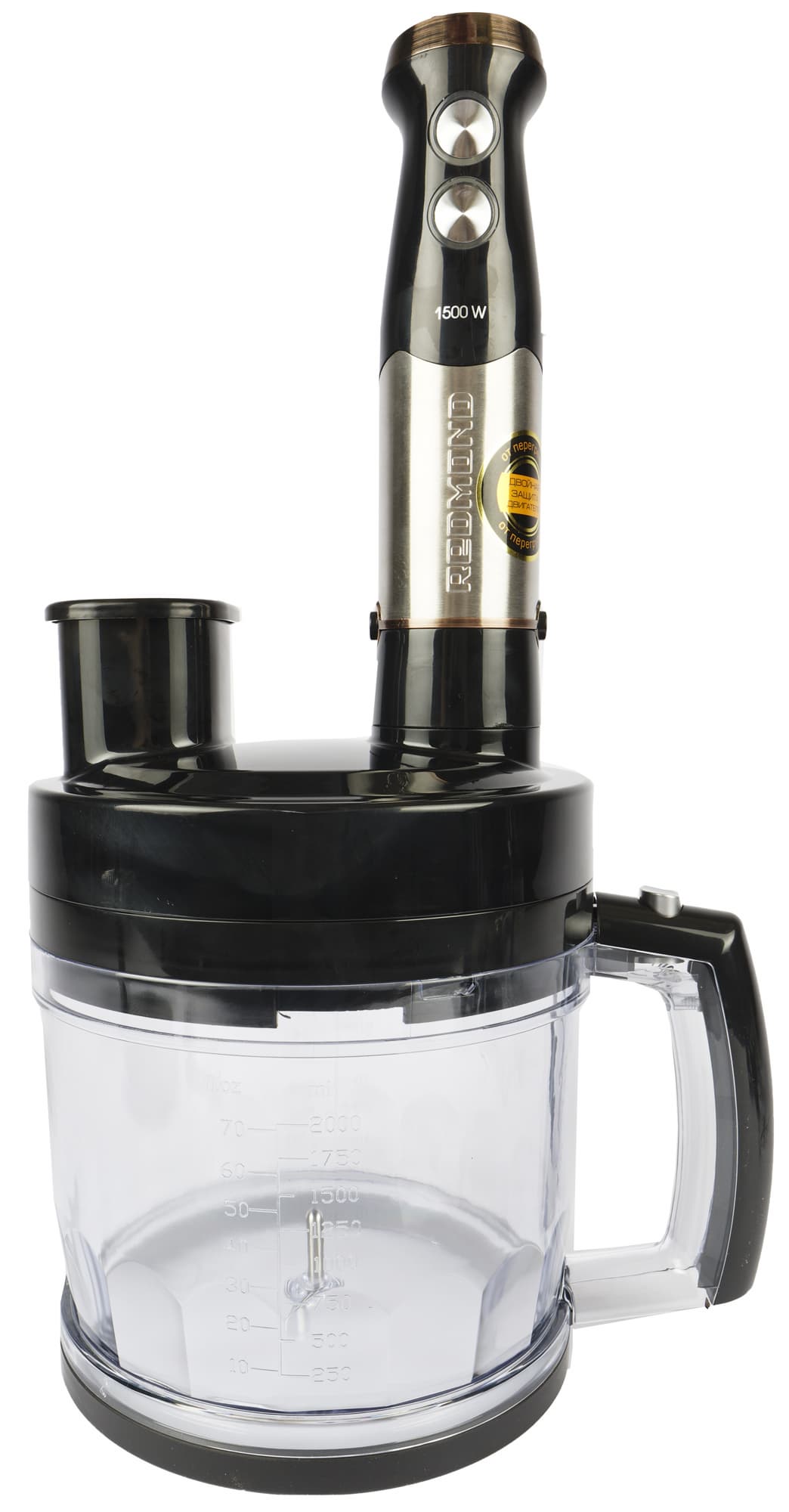 Комплект Redmond RHB-CB2988 состоит из большого количества элементов. Основой для них является моторный блок. Деталь имеет классическую для погружного блендера конструкцию.