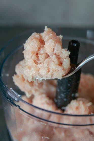 Убрали насадку для терки и шинковки и заменили пластиковый стержень на большой S-образный нож. 3 куриные грудки без кожи общим весом 760 г разрезали пополам и поместили в чашу. Блендер проработал 30 секунд на 2-й скорости обычного режима, и этого оказалось достаточно, чтобы филе стало отличнейшим равномерно нарубленным фаршем.