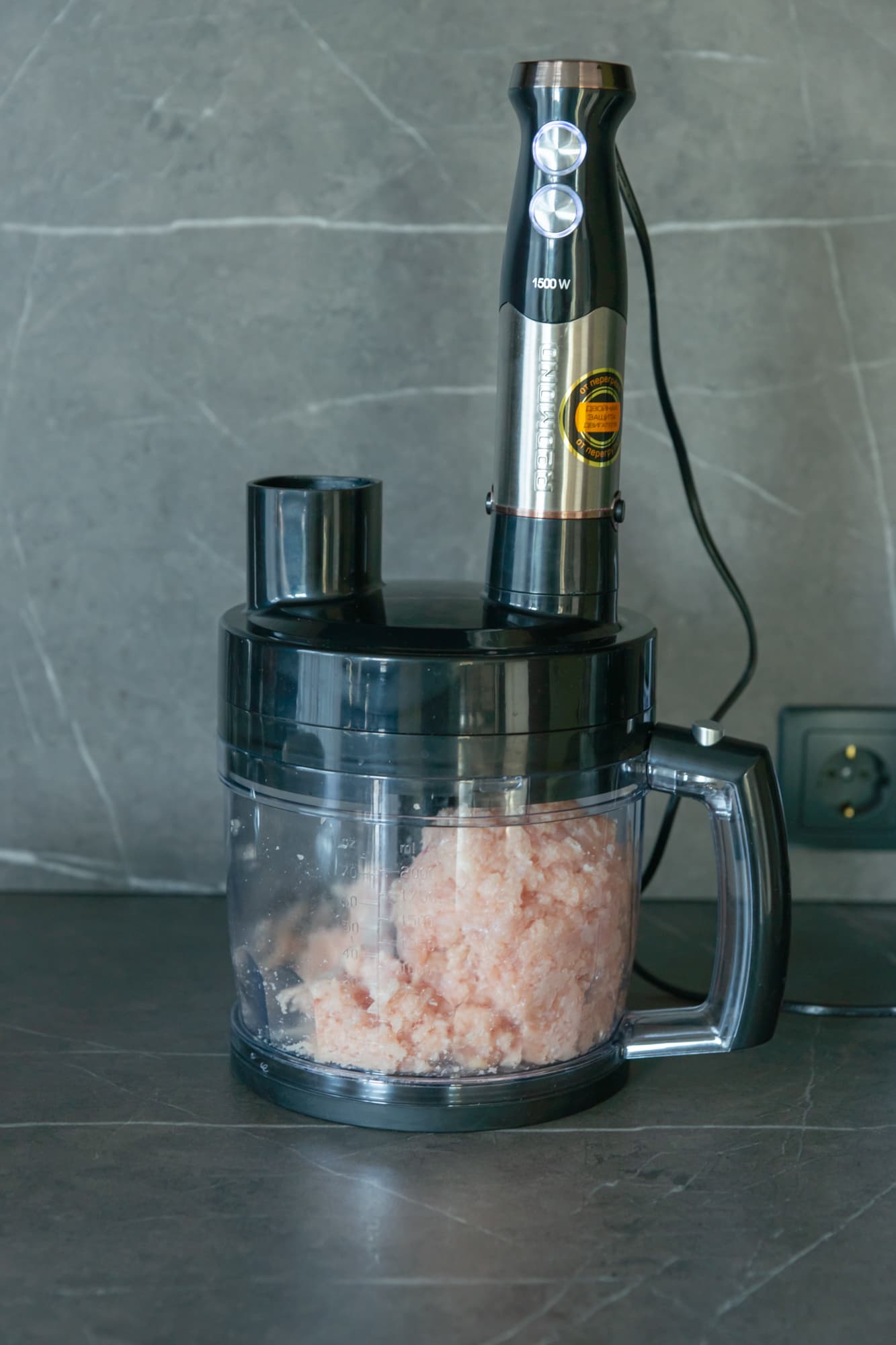 Моторный блок блендера удобно лежит в руке, кнопки нажимаются, не глядя. Колесико регулятора легко прокручивается большим пальцем той же руки, что держит моторный блок, таким образом вторая рука остается полностью свободной. Моторный блок увесистый сам по себе, а с насадкой-блендером становится еще тяжелее (800 г), на третьей минуте измельчения томатов мы это ощутили в полной мере — рука начала уставать. Погружной блендер не разбрызгивает содержимое стакана за его пределы, но для того, чтобы емкость не убегала, несмотря на резиновую подкладку, ее стоит придерживать рукой. Уровень шума устройства при работе любой из насадок умеренный и не вызывает дискомфорта.
