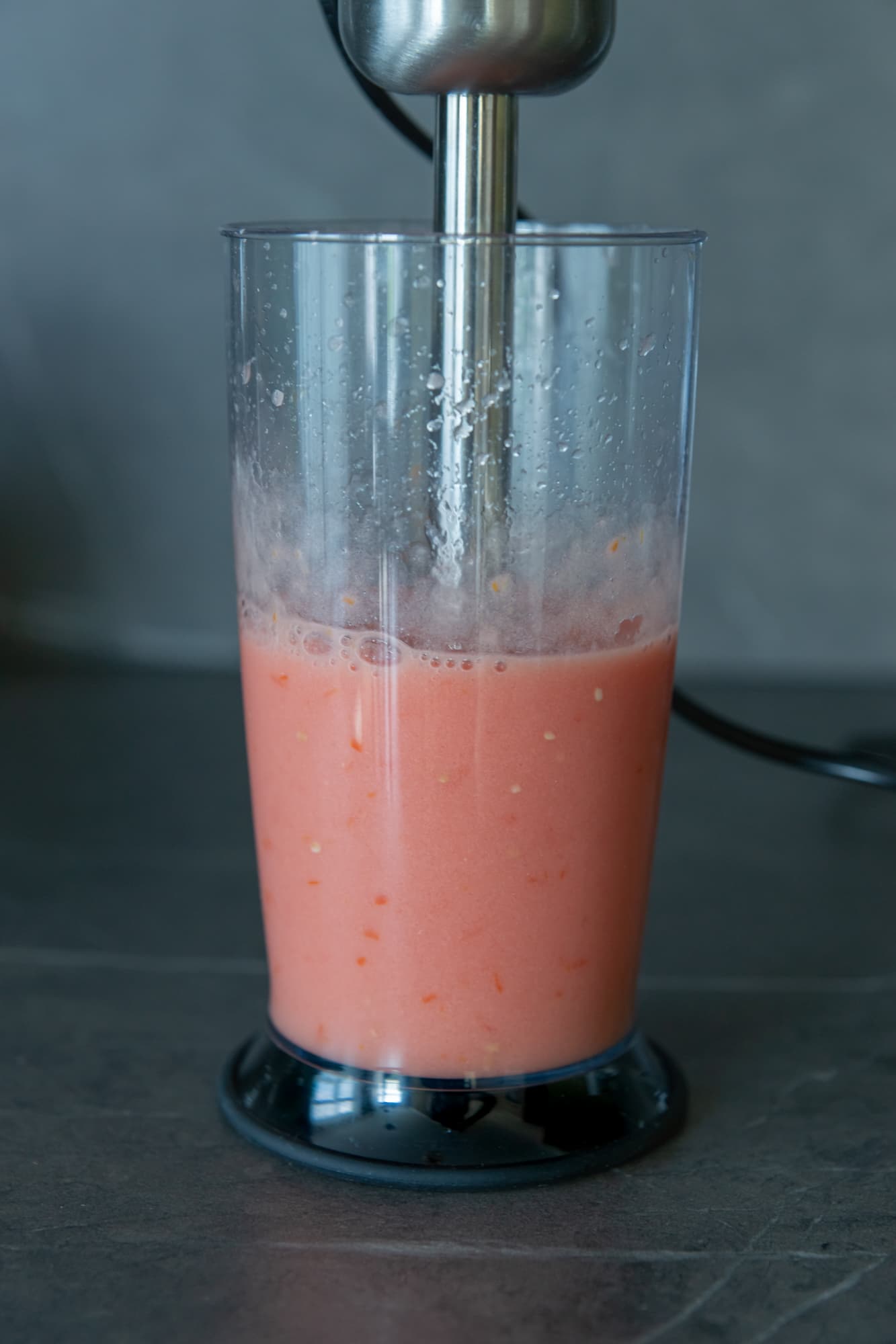 Результат не удивил, но и не огорчил. Как правило, таким он и бывает у стандартных погружных блендеров: хорошо взбитая помидорная масса с небольшими кусочками кожицы и частично не размолотыми семенами. Продукт в процессе измельчения за пределы стакана не разбрызгивался.