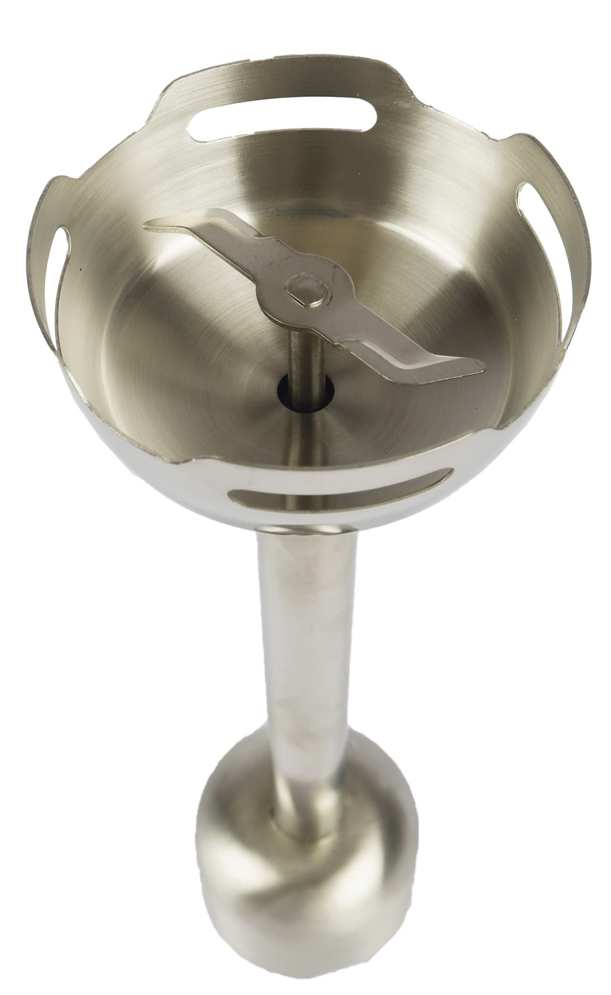 Классическая насадка-блендер с небольшим несъемным двухлопастным ножом полностью выполнена из нержавеющей стали. Нож закрыт металлическим куполом с прорезями.