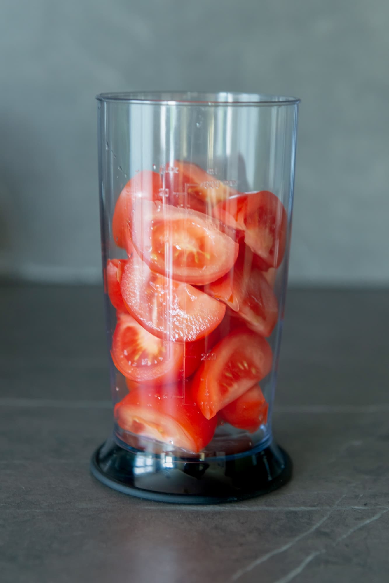 Наполнили стакан нарезанными помидорами в количестве 300 г и включили блендер на 1-й скорости. В ходе измельчения один раз останавливали работу блендера и вынимали из прорезей купола, скрывающего лезвия, кусочки со шкуркой. Спустя 1,5 минуты помидоры были перемолоты, но сквозь стенки емкости еще виднелись заметные кусочки шкурки.