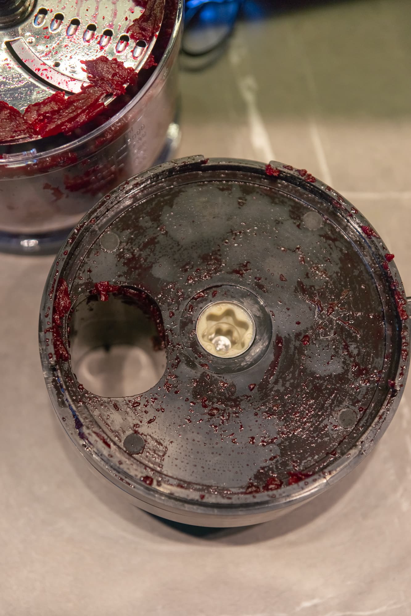 Переходим к большой чаше и изучению ее насадок. Шинковочный диск установили острыми лезвиями терки вверх, защелкнули крышку и подготовили свеклу, нарезав ее на куски по размеру горловины.