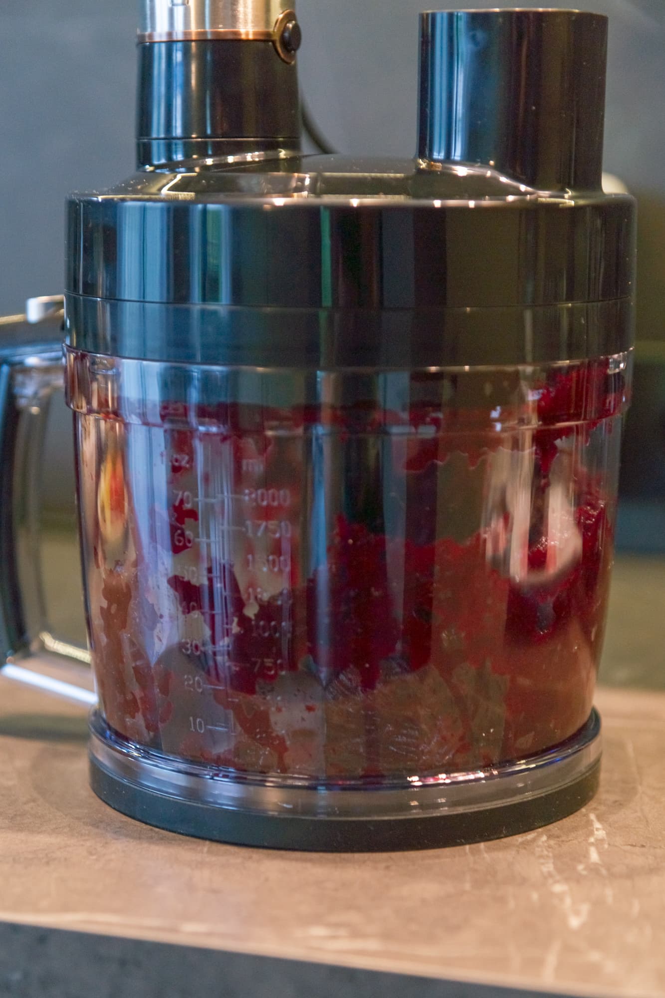 Установили моторный блок в гнездо на крышке, включили 1-ю скорость в основном режиме и стали по очереди закладывать в отверстие куски вареного корнеплода. Свекла моментально исчезала в горловине, не застревала, и нам даже не пришлось использовать толкатель.