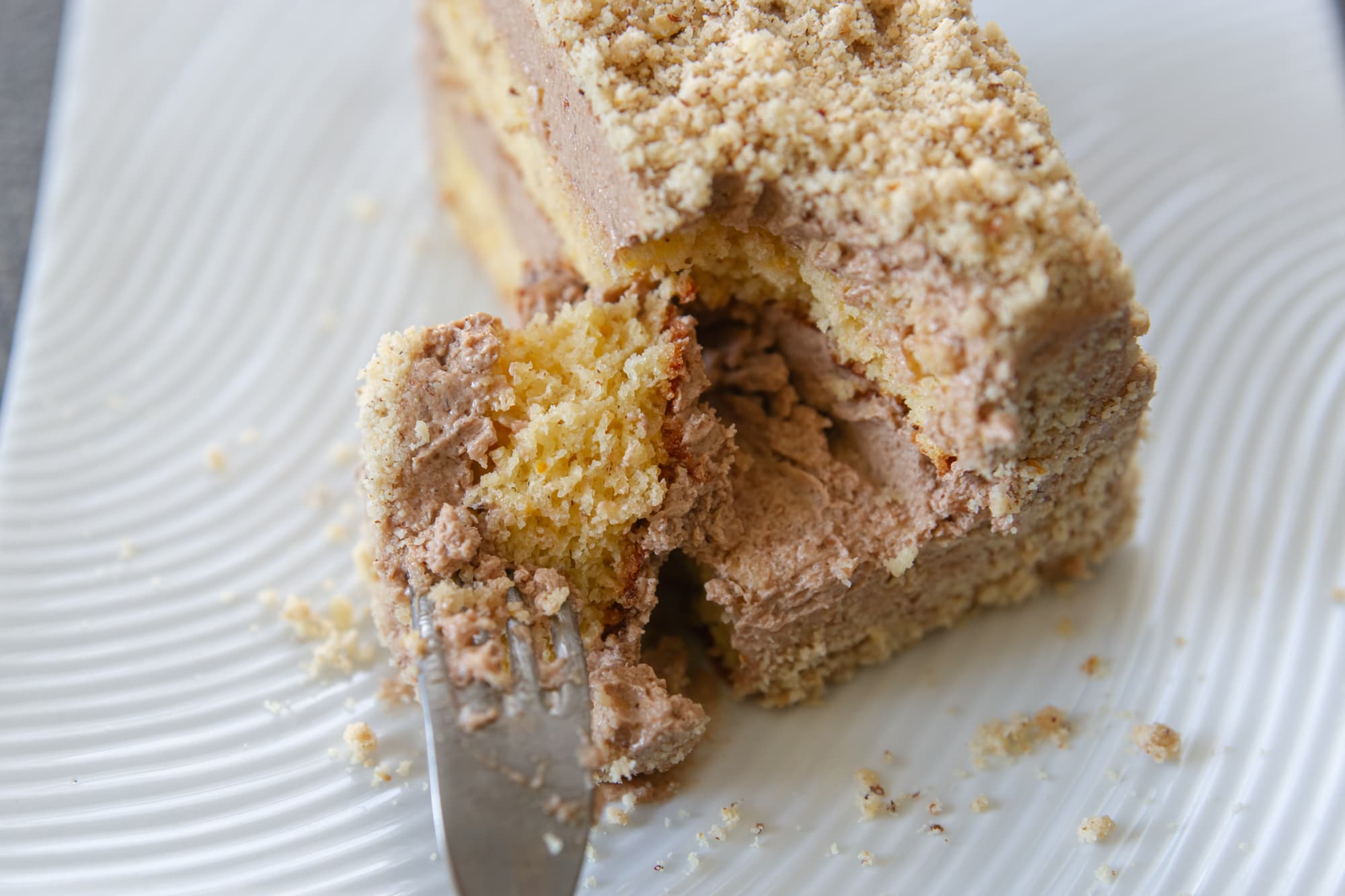 Просеянную муку соединили с разрыхлителем и солью. Постепенно перемешивая будущее тесто лопаткой снизу-вверх, вмешали муку и измельченный фундук. Выпекали бисквит в духовке при 180 градусах в течение 30 минут.