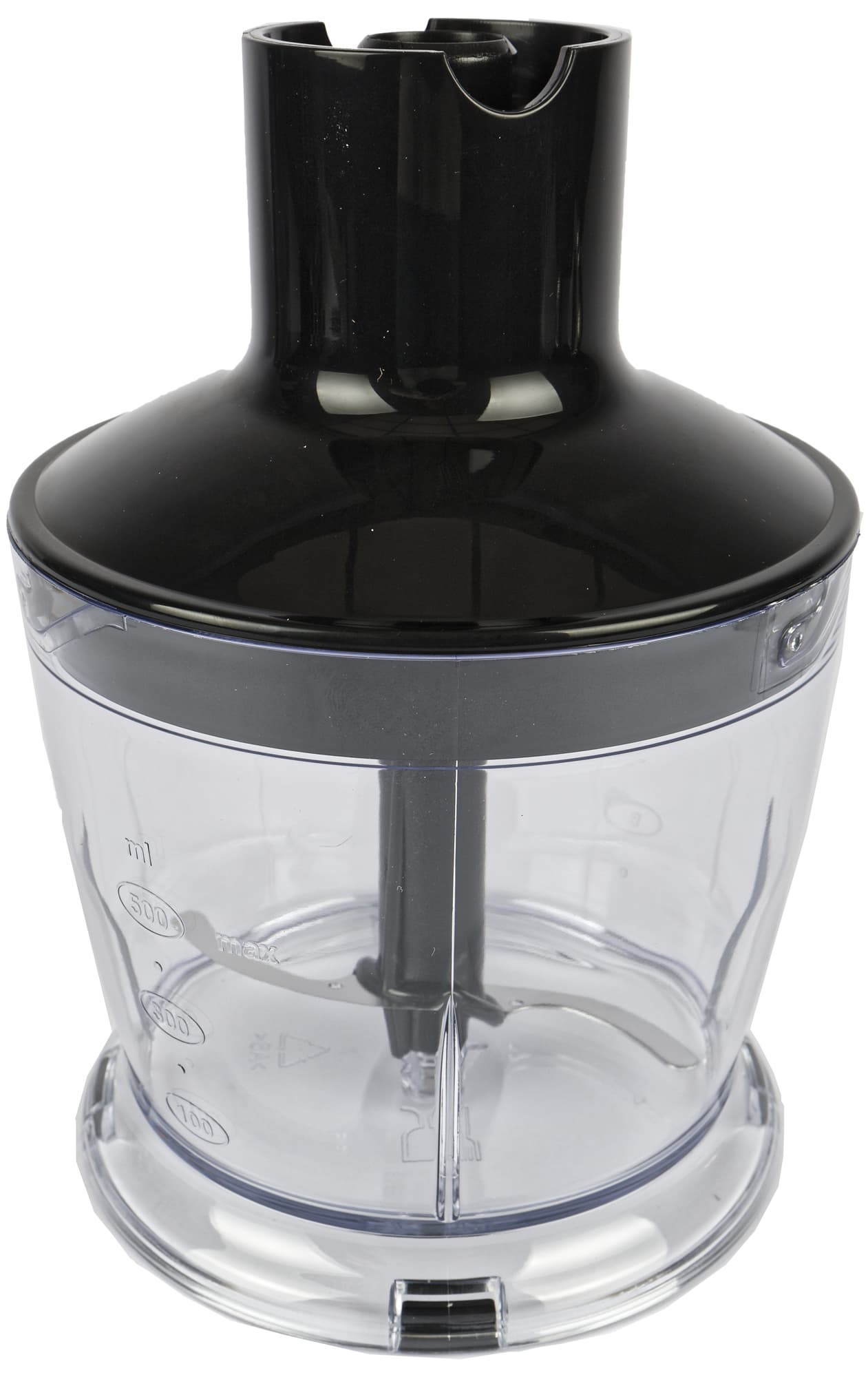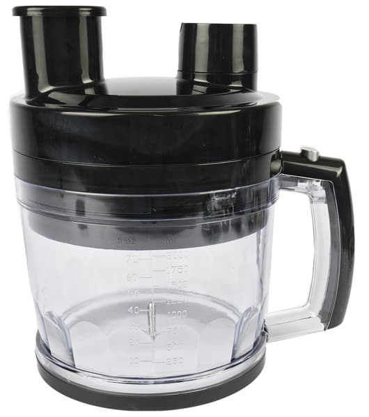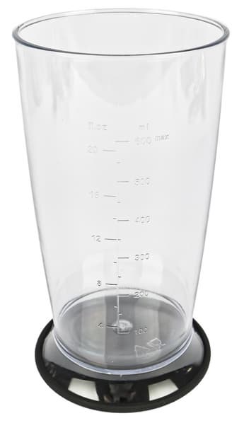 Малая чаша выглядит так же, как и все подобные емкости в комплектах погружных блендеров из серии «3 в 1». Корпус, представляющий собой широкий цилиндр на расширяющемся основании, изготовлен из прозрачного пластика, на стенке есть градуировки от 100 до 500 мл с шагом в 100 мл, а также от 4 до 16 унций с шагом в 4 унции.