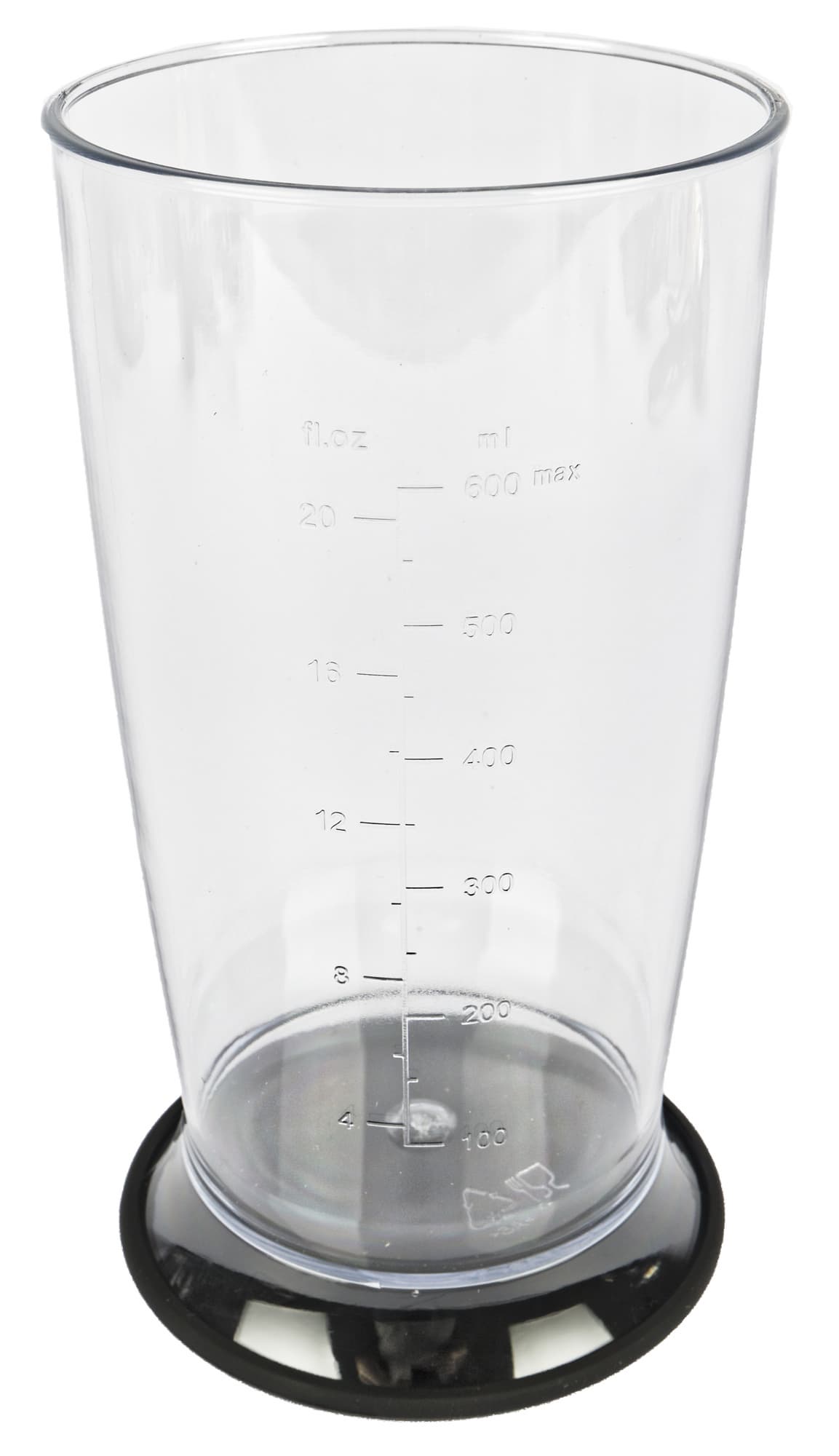 Для погружного блендера в комплекте предусмотрен стакан для измельчения из прозрачного пластика. На стенке емкости есть мерная шкала с рисками от 100 до 600 мл, с шагом в 50 мл.