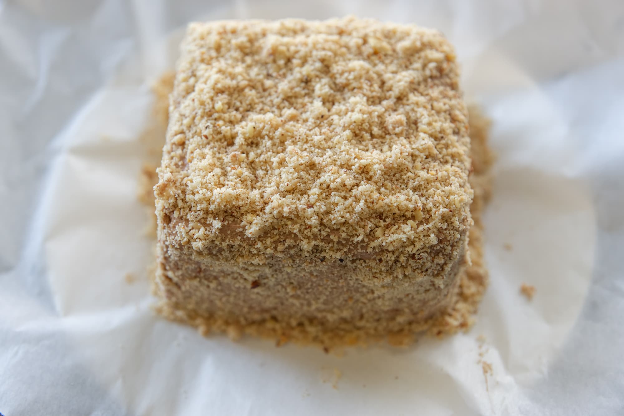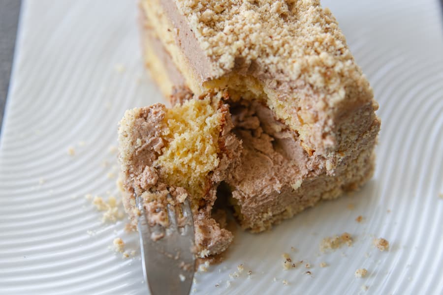 Полностью остывший бисквит разрезали на два коржа. Промазали будущий мини-торт кремом, посыпали ореховой крошкой и отправили в холодильник пропитываться.