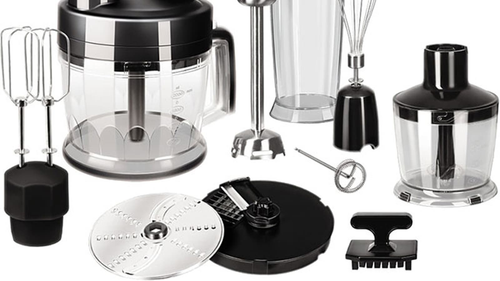 | Насадки | погружной блендер, венчик, насадка с двумя венчиками, вспениватель молока, насадка для нарезки кубиками, терка/шинковка, нож для измельчителя малый, нож для измельчителя большой |