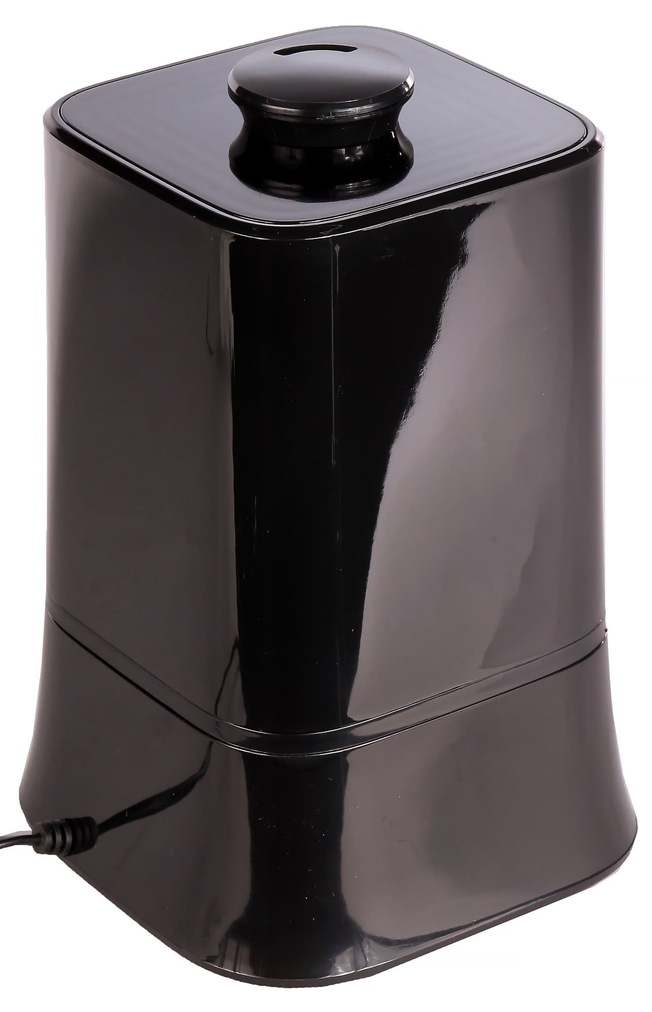 Прибор своими размерами и нейтральным дизайном напоминает термопот, однако вместо стального блеска мы видим черный глянцевый пластик. На этот раз рекламная наклейка снялась, не оставив следов на корпусе. На боковой стороне есть прозрачная вертикальная полоса, чтобы видеть оставшийся объем воды.