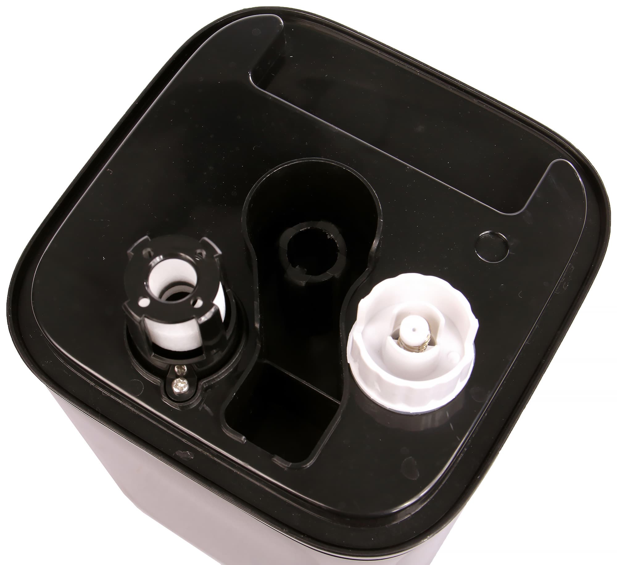 Для начала работы прибор протирают влажной тканью снаружи и споласкивают резервуар внутри. Никаких посторонних запахов мы не отметили, зато отметили удобство наполнения резервуара. Во-первых, благодаря небольшим размерам с ним удобнее управляться и можно воспользоваться достаточно глубокой раковиной, а не только краном в ванной. Во-вторых, крышка с соплом снимается, оставляя ровную поверхность, на которую можно поставить перевернутый резервуар и не держать его все время. В-третьих, маленькая белая крышка не требует долгого и нудного закручивания-раскручивания, а словно присасывается с одного оборота. В результате обслуживание прибора заметно ускоряется.
