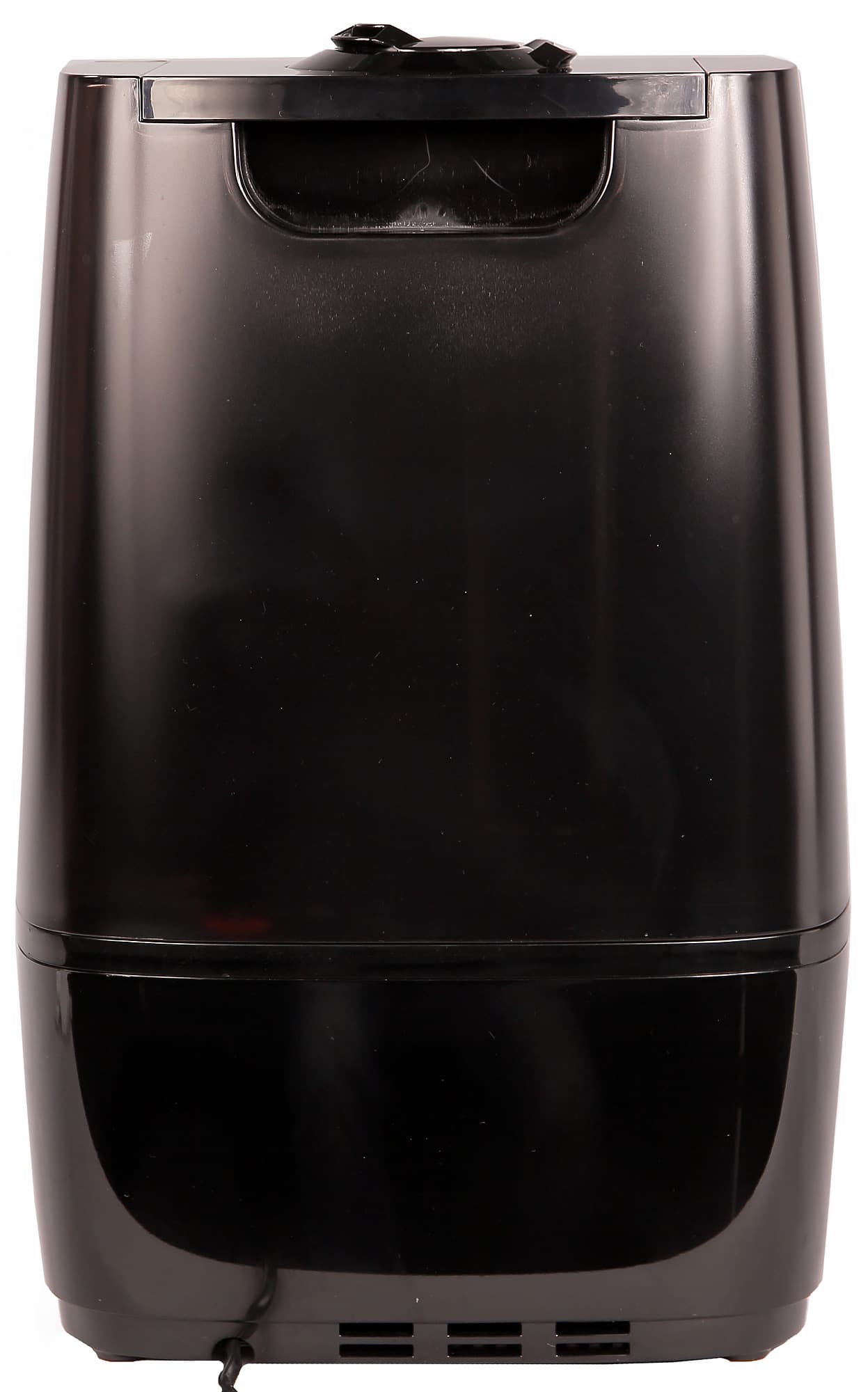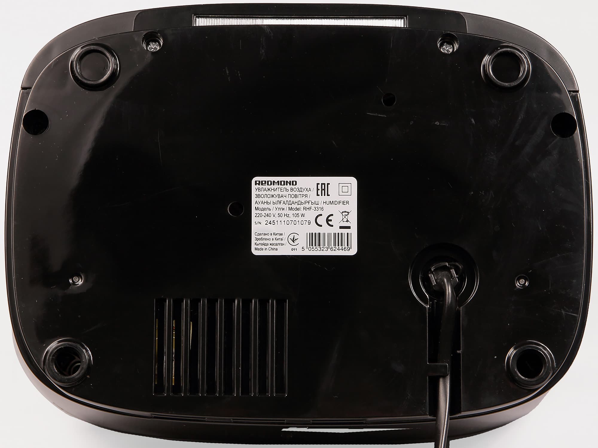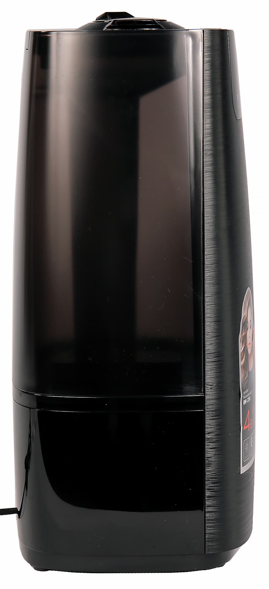 Резервуар для воды на просвет оказывается полупрозрачным, чтобы можно было видеть оставшийся объем воды. Электрический провод длиной 1,5 м, тоже черный, внутрь не прячется. Прибор устойчиво стоит на четырех пластиковых ножках в форме колец, на днище расположено вентиляционное отверстие.