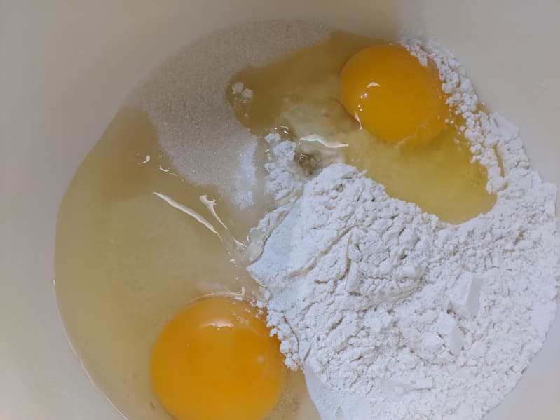 Взбили 150 граммов сахара, два яйца и 50 граммов муки (а еще щепотку соли и ванилина на кончике ножа) в крепкую пену с помощью насадок для взбивания. Затем добавили пол-литра молока и взбивали дальше — до полного растворения сахара.