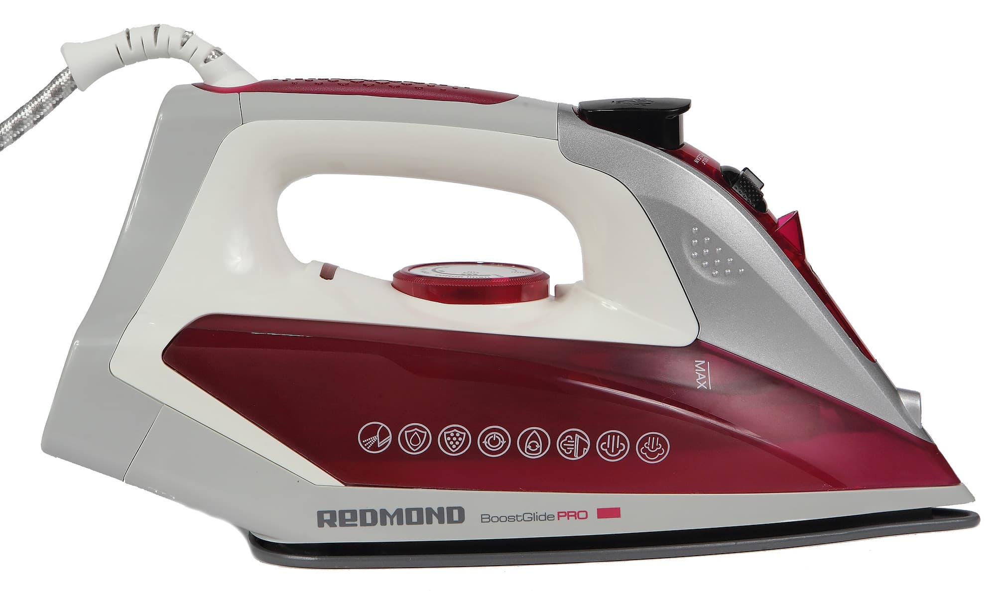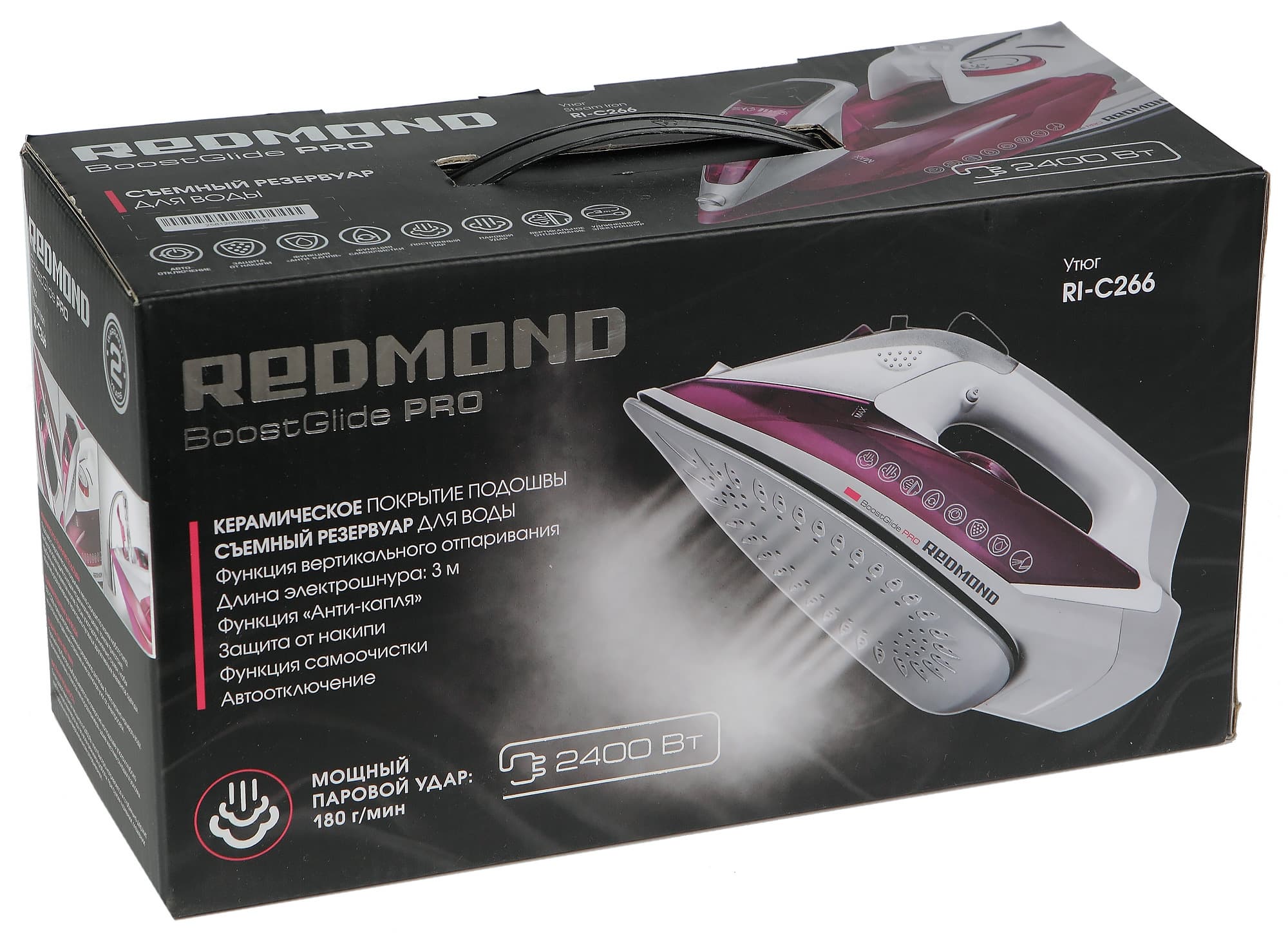 Утюг Redmond RI-C266 соответствует всем перечисленным требованиям, а также оснащен рядом дополнительных функций: капля-стоп, анти-накипь, самоочистка. При необходимости можно также воспользоваться вертикальным отпариванием. Основное отличие от его собратьев по линейке — съемный резервуар для воды.
