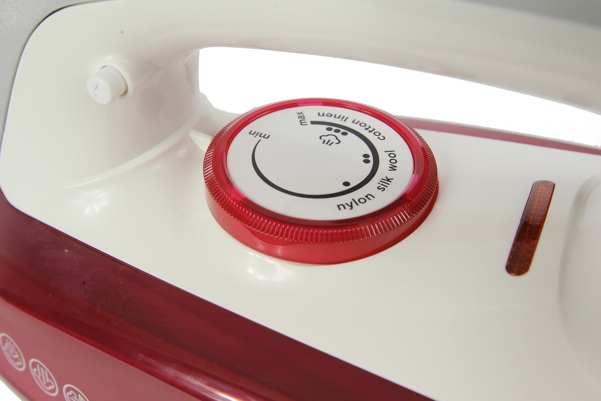 После включения утюга в сеть, загорается индикатор нагрева. Если перевести утюг в вертикальное положение, то индикатор нагрева в виде яркой узкой полосы будет расположен ниже термостата. Горит, как это ни странно, индикатор всегда. Насколько мы понимаем, он должен включаться только в момент нагрева подошвы, но светодиод горит все время, пока утюг включен в сеть.