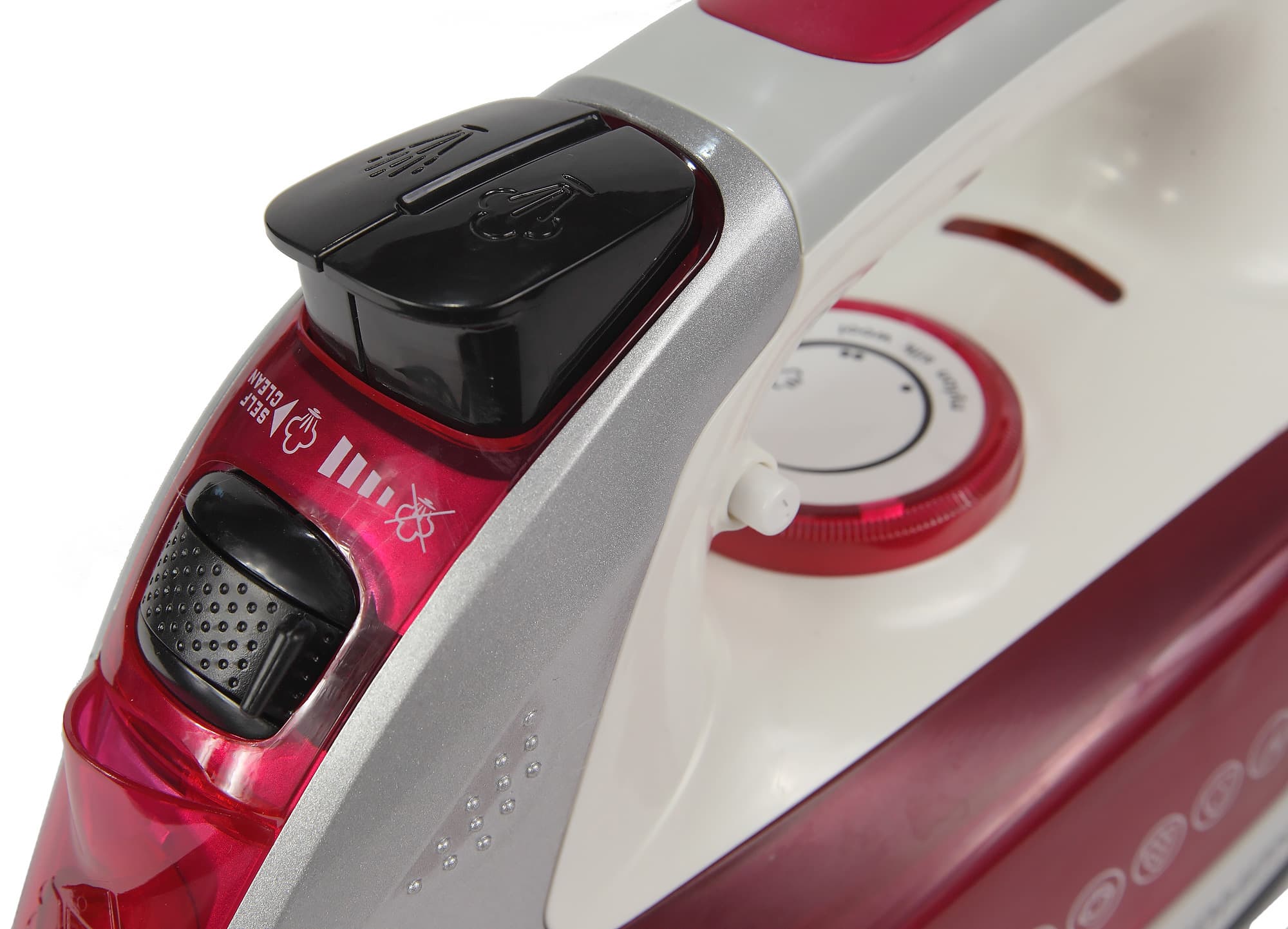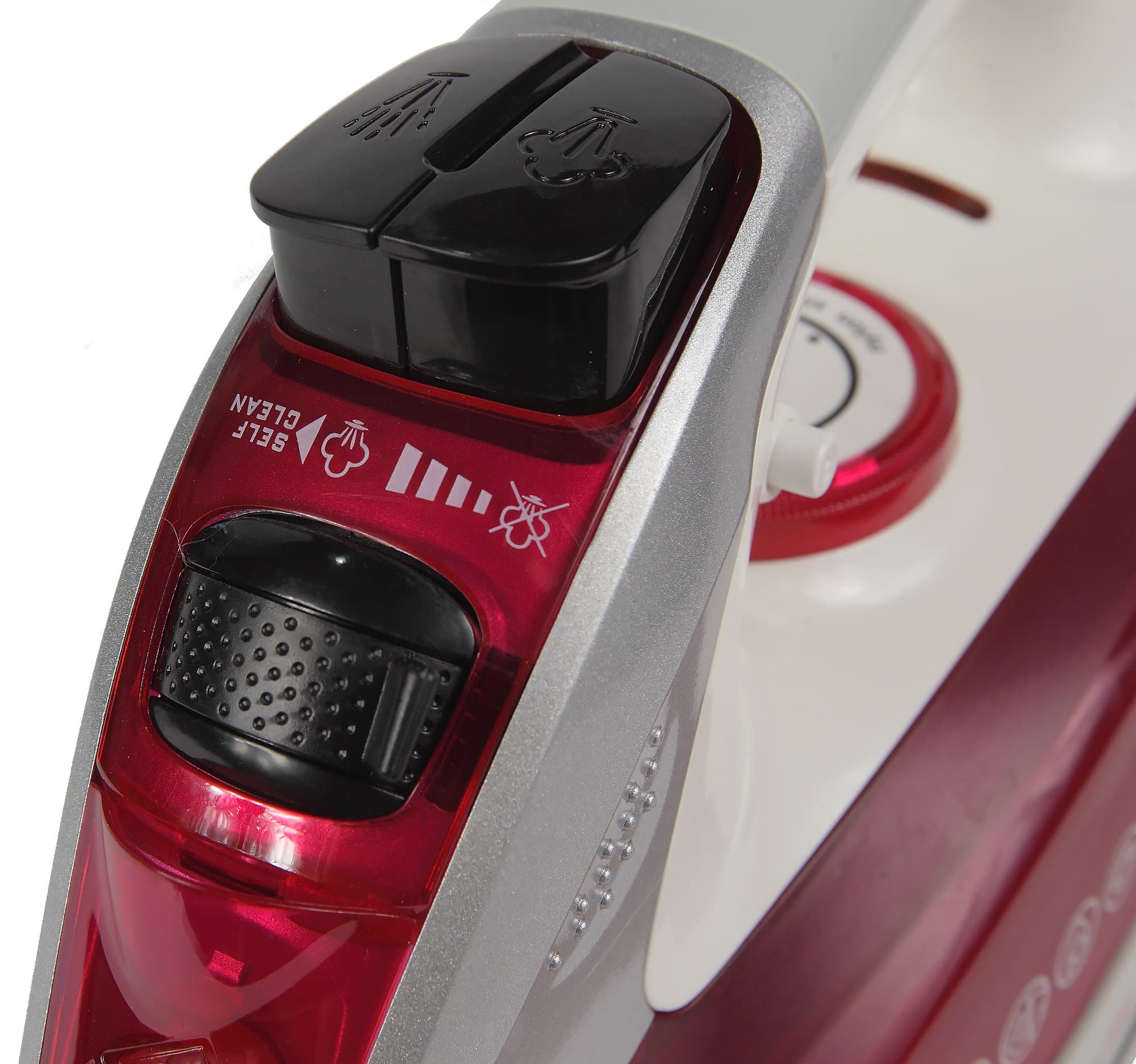 Под ручкой находится индикатор включения и терморегулятор. С внешней стороны ручки — остальные инструменты управления. Ближе к носику можно увидеть отверстие распылителя воды, выше — откидную крышку резервуара для воды, затем идет регулятор парообразования, над которым расположены две большие кнопки — распыления и парового удара.