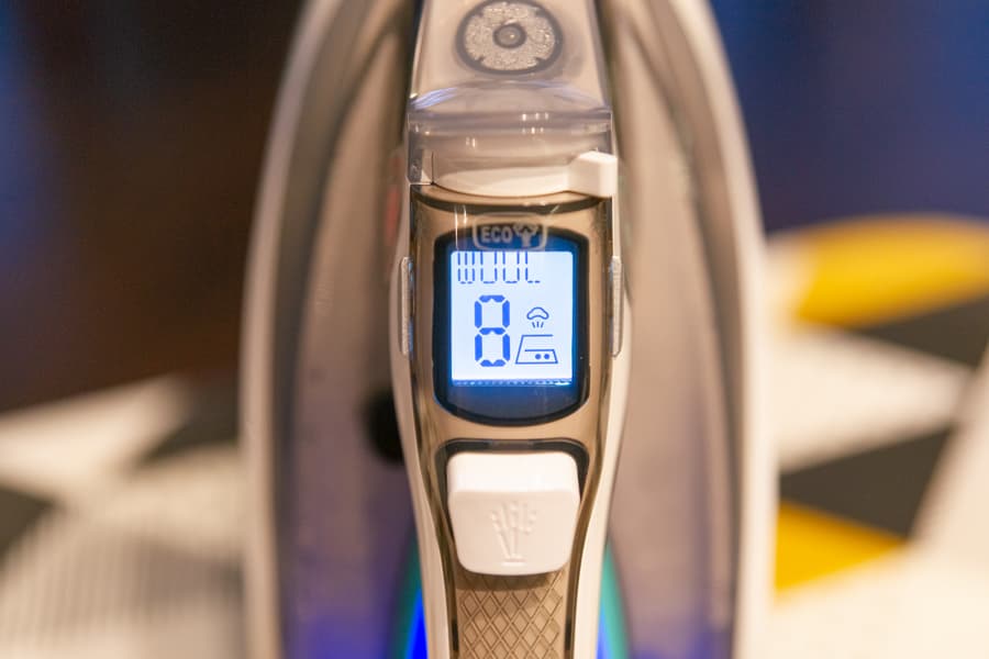 Затем утюг подключается к электросети. Звуковой сигнал и появившаяся синяя подсветка дисплея сообщат о готовности устройства к работе. Теперь можно переходить к выбору режима. Для этого задействуются кнопки «−» и «+» по бокам от дисплея. Во время выбора, на экране будут видны условное обозначение температурного режима, номер и название программы.