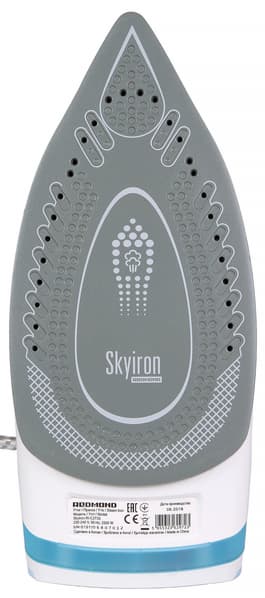 Поверхность подошвы утюга гладкая, без зазубрин и царапин, обработана керамическим покрытием. Форма подошвы — обычная треугольная с округлыми гранями, скругленными углами и зауженной вершиной. По периметру боковых сторон и в узкой части вершины в один ряд расположены отверстия выхода пара. Особый рельеф подошвы с выемками разной формы и геометрическими узорами призван равномерно распределять потоки пара по обрабатываемой ткани.