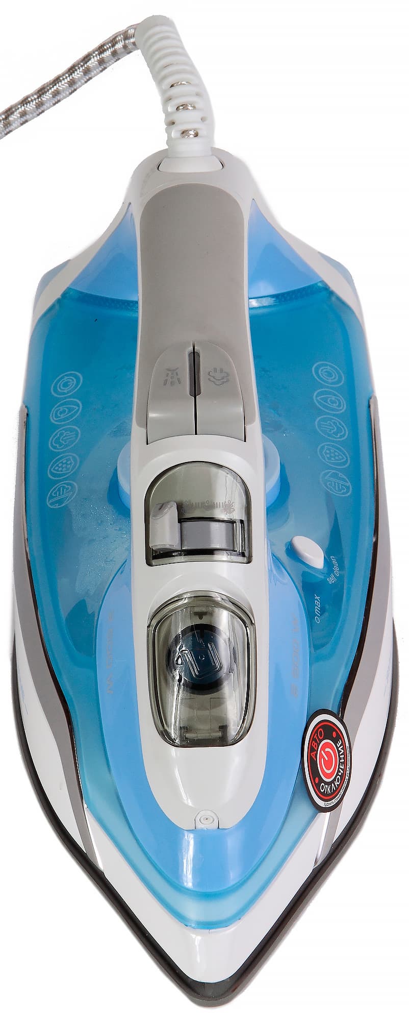 Отметим наличие функции автоматического отключения при простое. Утюг самостоятельно отключается в любом положении — хоть вертикальном, хоть горизонтальном. При падении или переворачивании нагрев подошвы отключается через 1-2 секунды. Форма подошвы стандартна и удобна при обработке изделий сложного кроя.