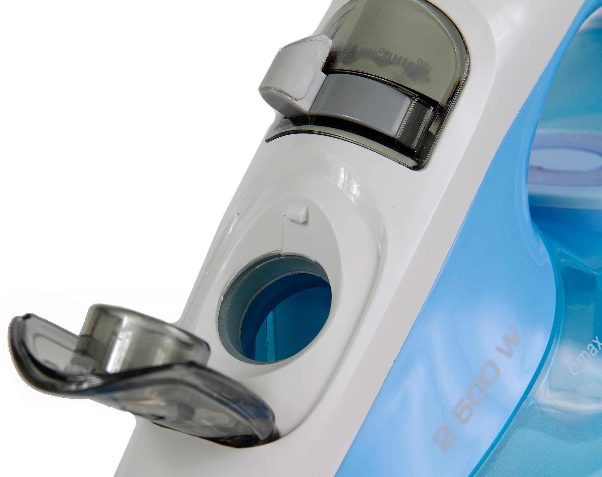 Крышка откидывается с небольшим усилием, закрывается со щелчком. Диаметр отверстия для заполнения водой в 1,7 см делает безопасной и лёгкой заливку воды внутрь утюга. Как производитель, так и мы, рекомендуем использовать для этого комплектный стаканчик. Прозрачный пластиковый стакан с зауженным носиком рассчитан на объем в 200 мл.