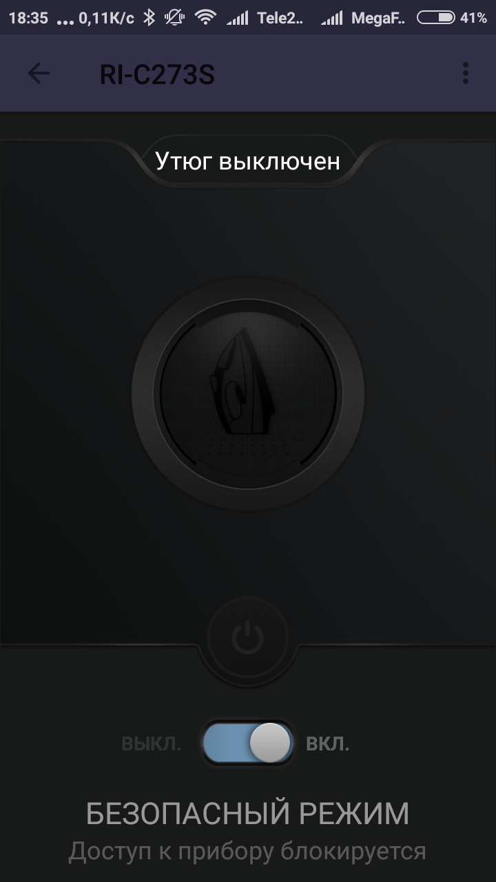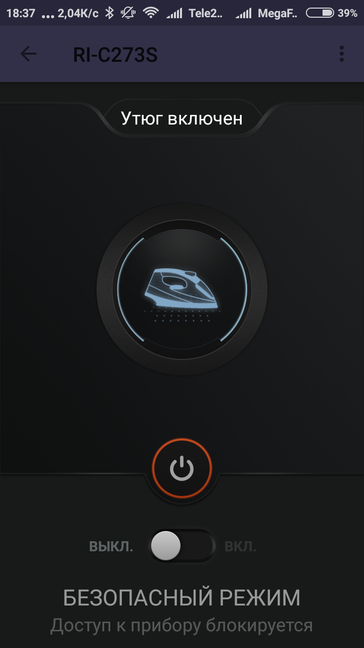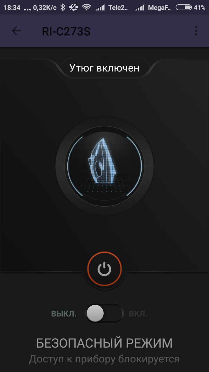 Подключение утюга к мобильному приложению сопровождается звуковыми и световыми сигналами. Для обеспечения стабильной связи устройства должны находиться на расстоянии не более 15 метров друг от друга. С помощью приложения можно наблюдать за положением утюга в пространстве, включить безопасный режим и отключить прибор. Управление этими тремя функциями элементарно — достаточно нажать на экране мобильного устройства на соответствующую кнопку. На экране телефона все происходящее выглядит следующим образом: