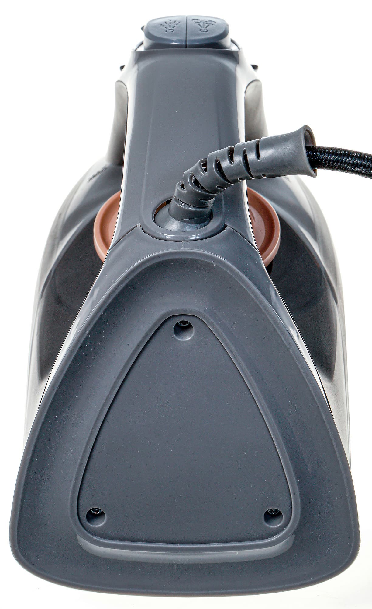 Шнур электропитания прикреплен к корпусу в задней части ручки посредством шарового шарнира. Место соединения защищено гибким 5-сантиметровым кожухом, чтобы предотвратить повреждение кабеля от перегиба. Длина в два метра представляется нам достаточной как при использовании обычной гладильной доски, так и доски с розеткой.
