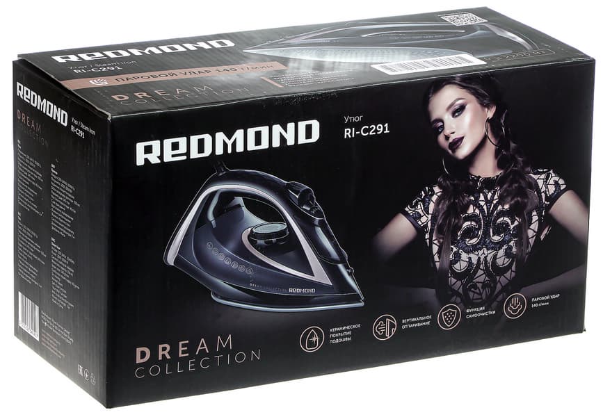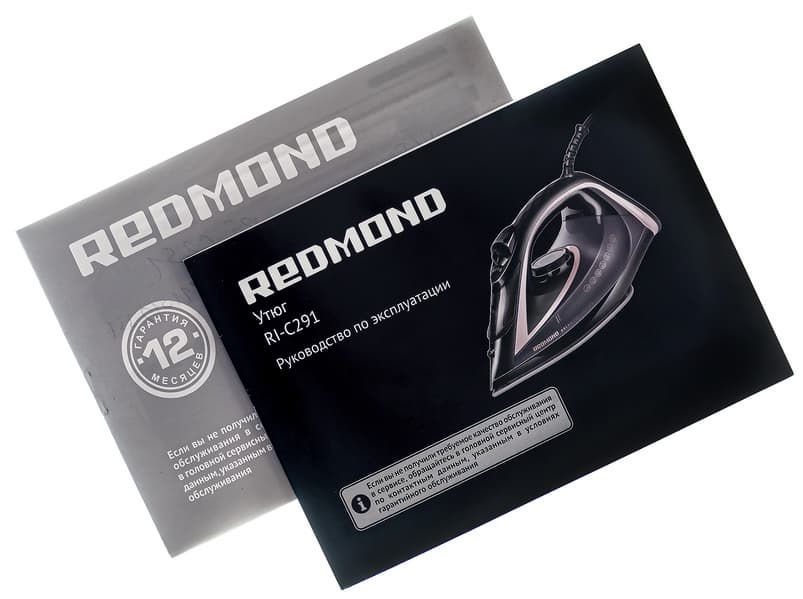Утюг Redmond RI-C291 поставляется в коробке, оформленной в фирменном стиле Redmond. К счастью, стиль стал значительно спокойнее, чем еще пару лет назад. На черном фоне упаковки размещены фотографии как самого прибора и его частей, так и традиционной для компании симпатичной девушки. Текстовая информация позволит ознакомиться с техническими характеристиками и особенностями прибора. Никаким приспособлением для переноски упаковка не оснащена, но она столь небольших габаритов, что без труда поместится в руках.
