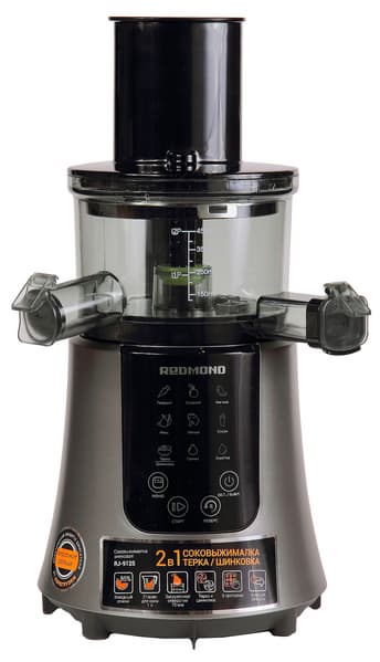 Redmond RJ-912S — классическая вариация подобных моделей с вертикально расположенным шнеком. Но внешне эта соковыжималка отличается от привычной нам фигуры с длинной горловиной и загрузочным лотком. У этого прибора верхняя часть напоминает пеликаний зоб, позволяющий загрузить в себя некоторые ингредиенты целиком.