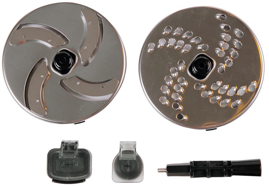 Также к прибору прилагаются две круглые насадки: шинковка и терка, к ним в придачу — отдельная крышка чаши, втулка и маленький толкатель. Все это выглядит довольно привычным образом, как в любом кухонном комбайне.