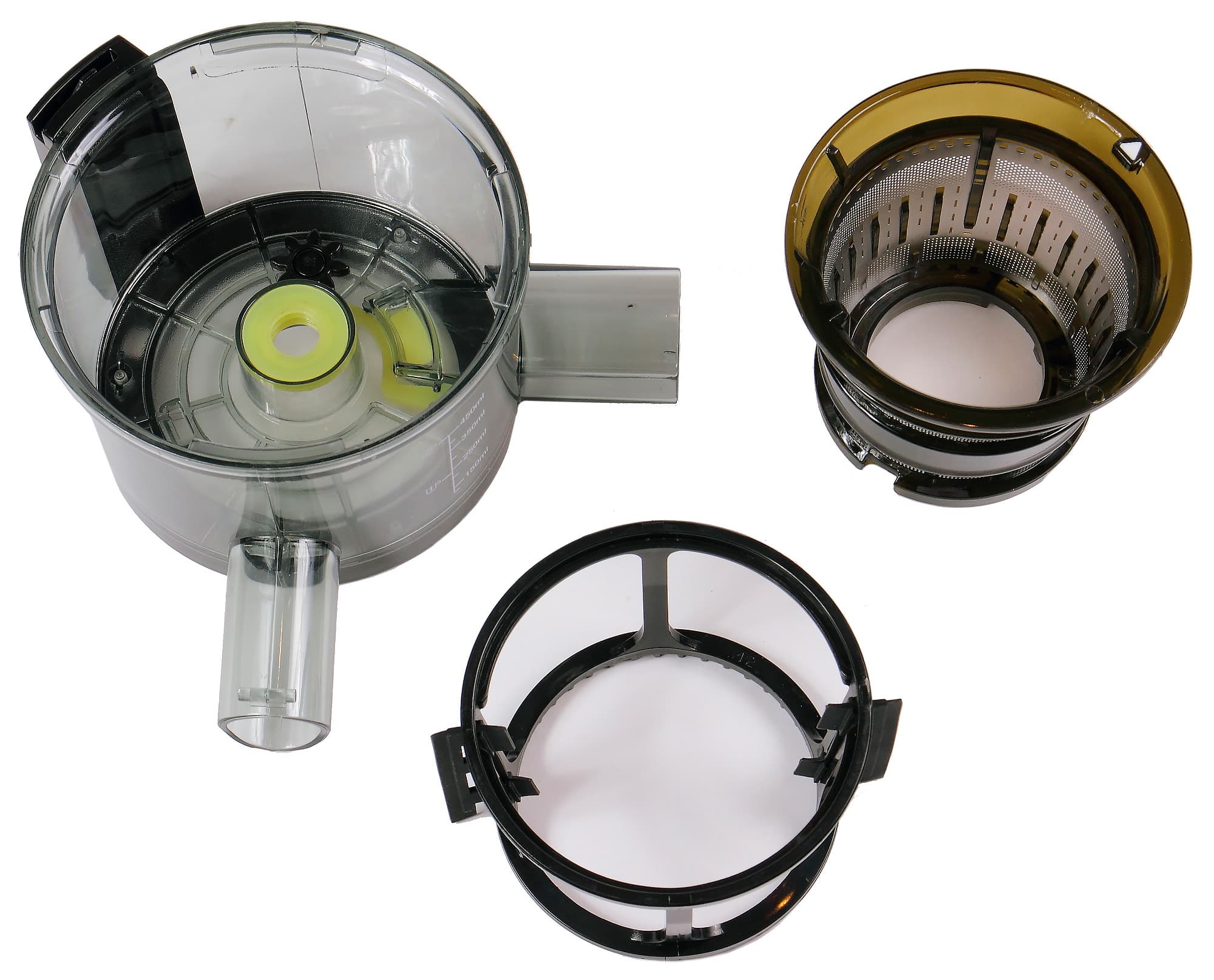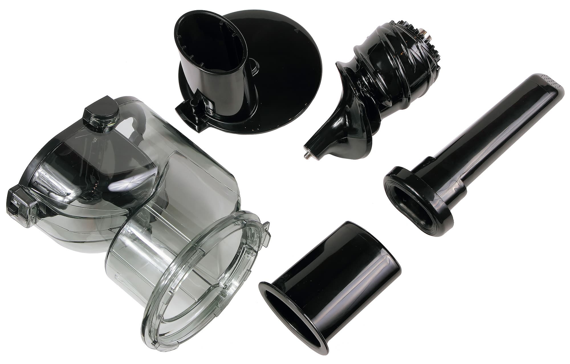 Чаша сепаратора (круглая в поперечном сечении пластиковая деталь) имеет два носика: круглый для выхода сока и прямоугольный для выхода жмыха. Выходные отверстия имеют крышки для блокировки выхода продукта. На дне чаши — отверстие для шнека или втулки, герметизированное силиконовым кольцом. Снизу, под дном, находится силиконовый запорный клапан для жмыхового носика. Механизм, наполняющий чашу, состоит из сетчатого фильтра, в который вставляется шнек и вращающегося очистителя, надевающегося на фильтр.