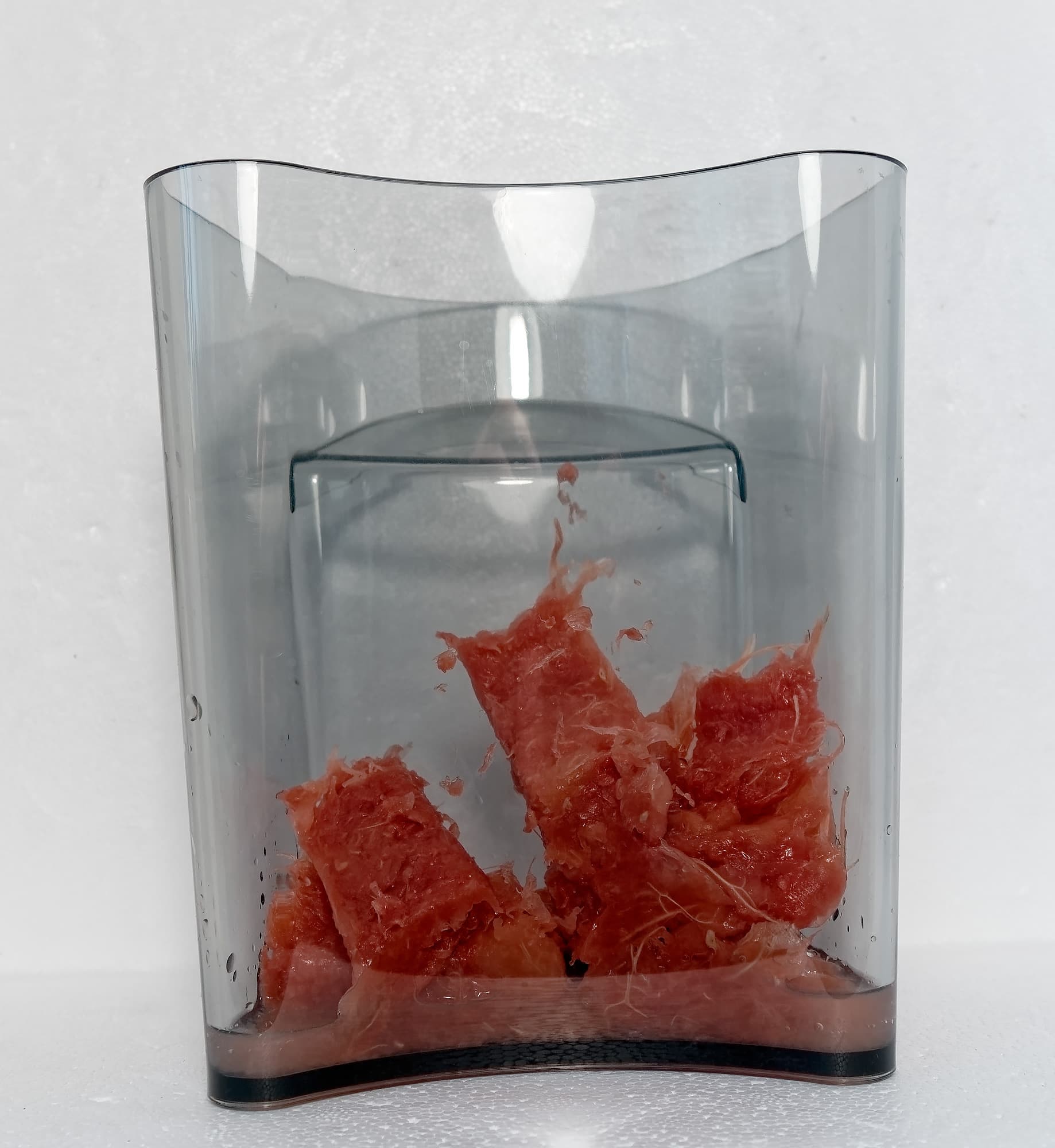 Берем 4 томата, 1 лимон, 1 зубчик чеснока, смешиваем на режиме «микс». Лимон немного поболтался в разных частях конструкции, но потом упал и отжался удовлетворительным образом. Чеснок вышел из этой передряги практически нетронутым. Мы выловили его и выжали другой с помощью чеснокодавилки.