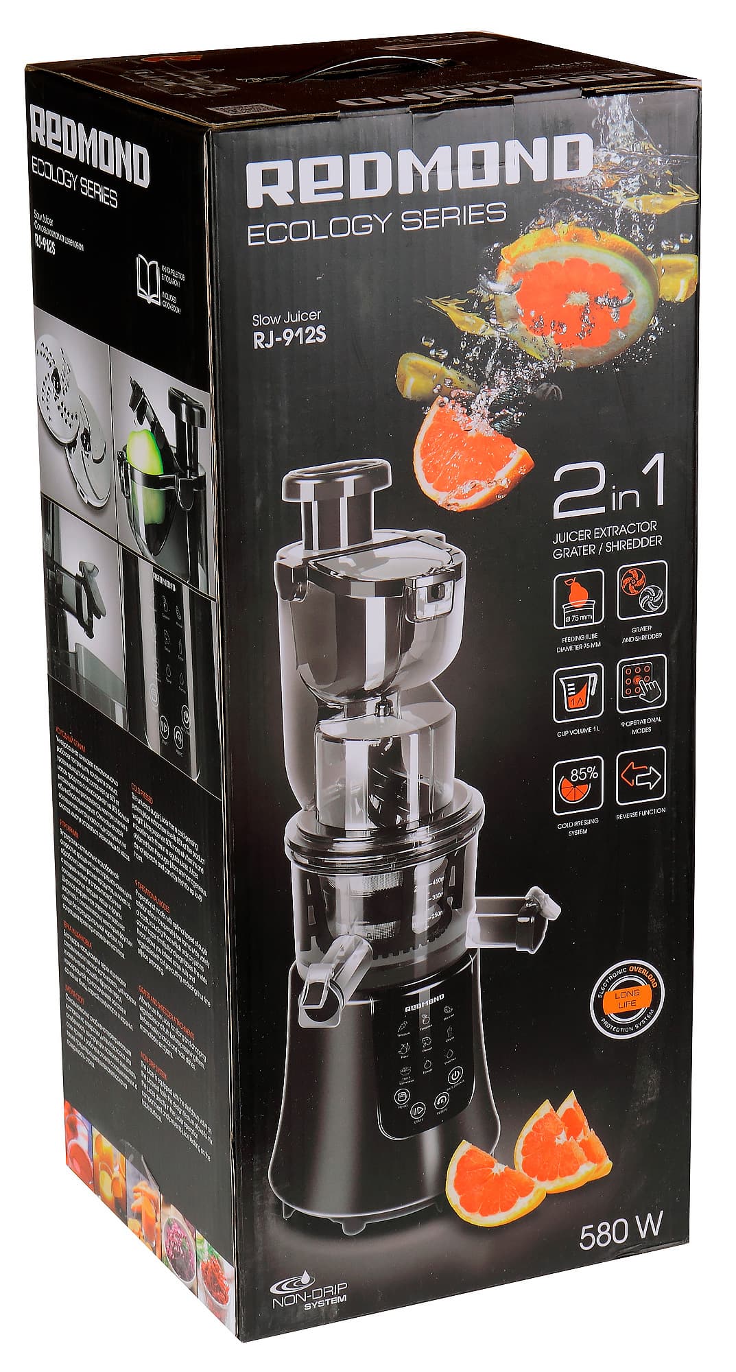 Прибор поставляется в высокой и узкой прямоугольной коробке фирменных цветов Redmond. Коробка сверху оборудована ручкой.