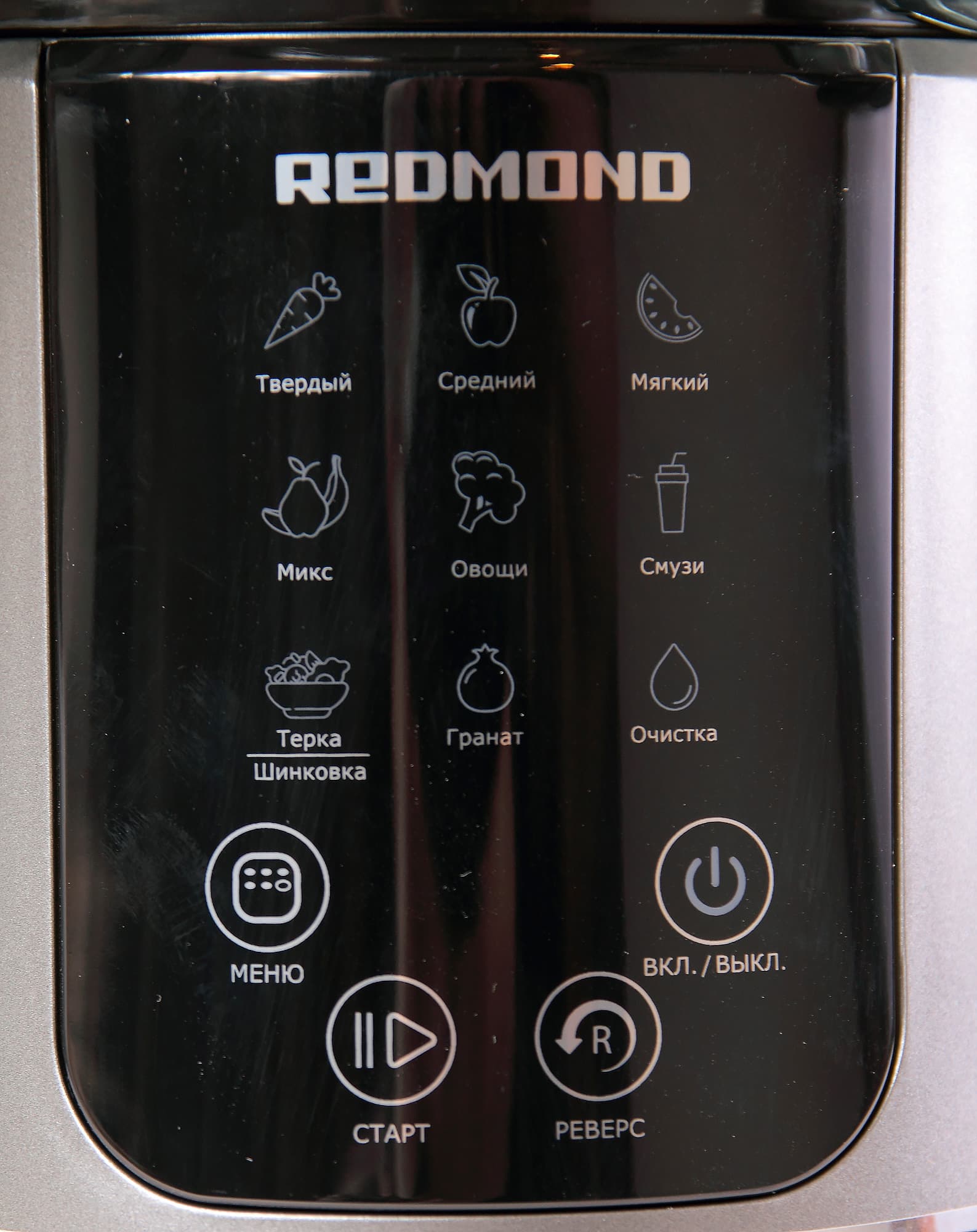 Сверху на панели — три ряда по три кнопки. Это режимы работы: твердый, средний, мягкий, микс, овощи, смузи, терка/шинковка, гранат, очистка. Отличаются соковыжимательные программы, в основном, показателями мощности.