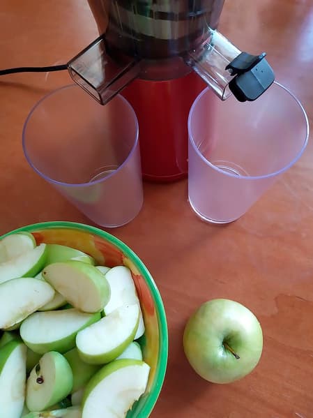 Яблоки порезали на 4-5 частей (по рекомендации инструкции), сердцевины и шкурку не удаляли. Взвесили ровно 1 кг сырья и приступили к отжиму сока.