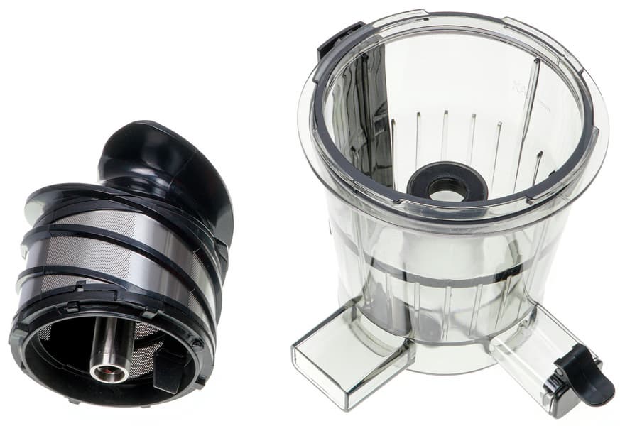 «Верхушка» состоит из нескольких частей. Во-первых, это чаша сепаратора, выполненная из прозрачного дымчатого пластика. В чашу вставляется конструкция из шнека и сетчатого фильтра с довольно мелкой сеткой (верхний обод фильтра — съемный, что очень кстати при очистке прибора). Чтобы чаша закрепилась на корпусе, необходимо проверить, правильно ли установлена силиконовая заглушка у носика для вывода жмыха. Носик для вывода сока оснащен клапаном с уплотнительной резинкой — когда он закрыт, сок не вытекает. Удобно, если нужно отойти от соковыжималки, чтобы, например, освободить заполненный жмыхом стакан. Кроме того, при закрытом клапане можно смешивать соки из разных продуктов прямо в чаше сепаратора.