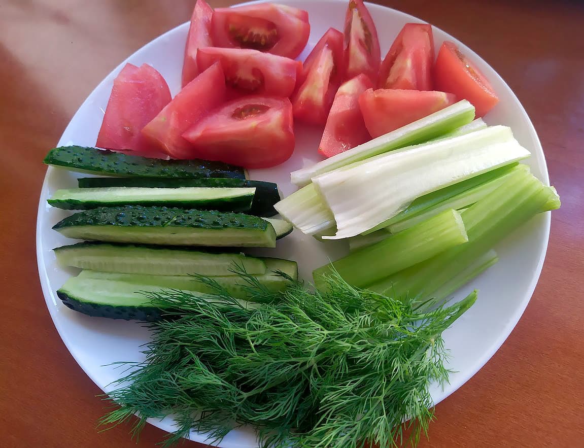Порезали два помидора, два огурца, два стебля сельдерея и добавили ко всему этому несколько веточек укропа.