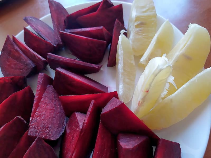 Четыре небольших свеклы порезали на дольки, почистили лимон — всего 600 граммов сырья.