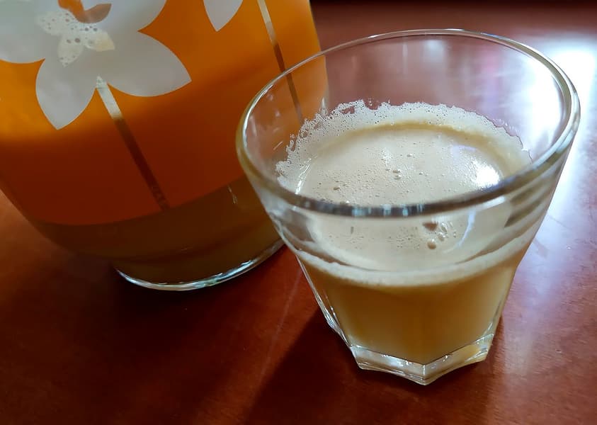 Обещание производителя выполнено — сока вышло даже больше, чем обещанные 85%. Он насыщенный, полупрозрачный, с небольшим количеством мякоти. Но есть замечание: жмых довольно влажный, то есть сока могло быть и больше, но часть его сгинула вместе с отходами производства.