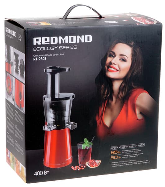 Прибыла RJ-980S к нам в стандартной для Redmond упаковке: волоокая красотка (на этот раз брюнетка) соседствует на ней с непосредственно соковыжималкой и некоторыми техническими данными прибора.