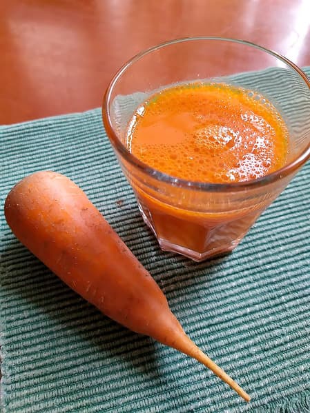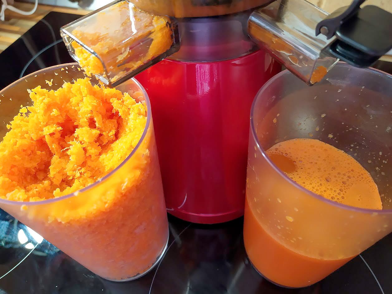 Снова мокрый жмых (отличная, кстати, основа для морковного торта или печенья), и его очень много — стакан пришлось разок опустошить, чтобы все влезло. Самого сока же — 370 граммов (37%), 350 мл, пены, можно сказать, и нет. Мякоть через некоторое время оседает на дно стакана.