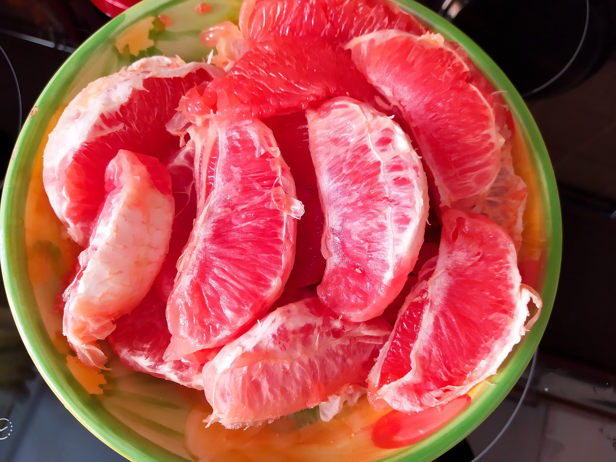 Грейпфрут очистили от мякоти и белых пленок, снова взвесили ровно килограмм. Разделили плоды на дольки.